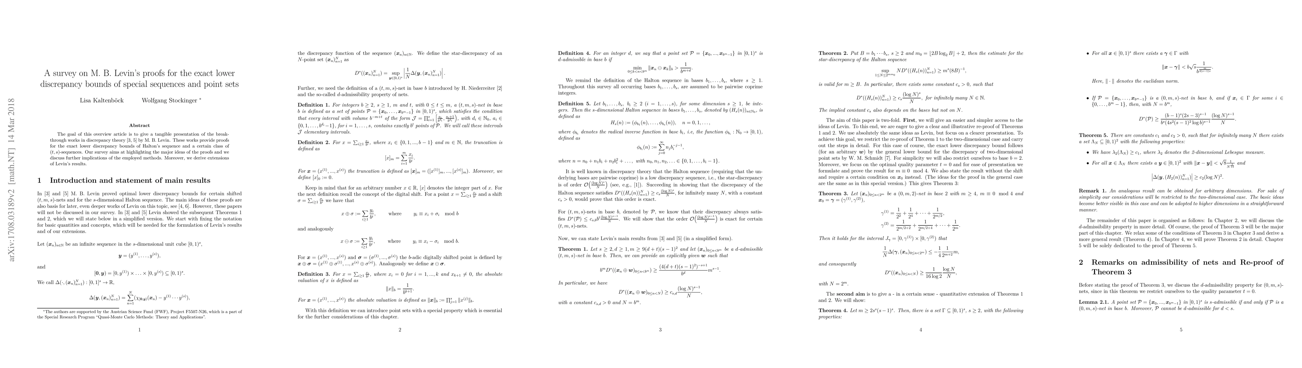 This paper surveys M. B. Levin's groundbreaking work on establishing exact lower discrepancy bounds for Halton's sequence and $(t, s)$-sequences, elucidating the key ideas and implications of his methods, and extending his findings.