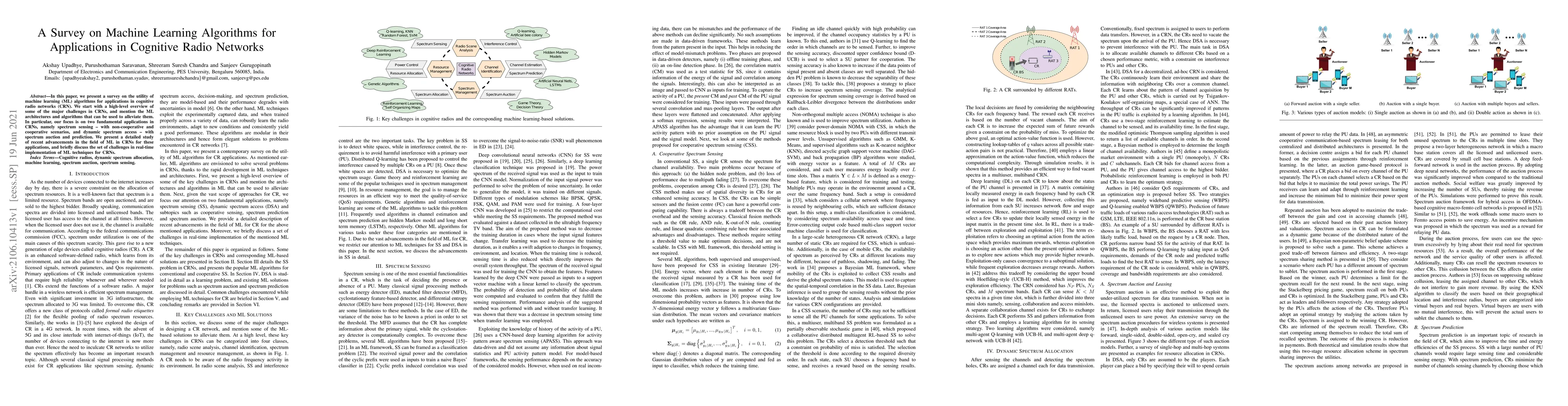 This paper surveys machine learning algorithms for cognitive radio networks, focusing on spectrum sensing and dynamic spectrum access. It reviews recent advancements and discusses challenges in implementing ML techniques in real-time CRN applications.