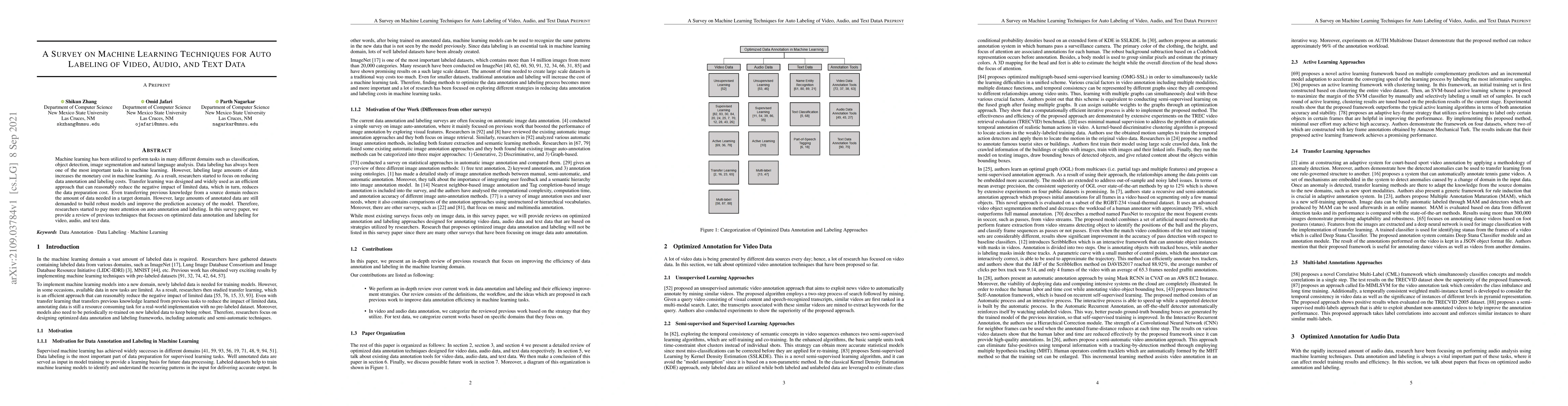 This survey paper reviews machine learning techniques for automating the labeling of video, audio, and text data, aiming to reduce the high costs associated with data annotation. It highlights the role of transfer learning in minimizing the need for large annotated datasets and explores various methods for optimized data labeling.