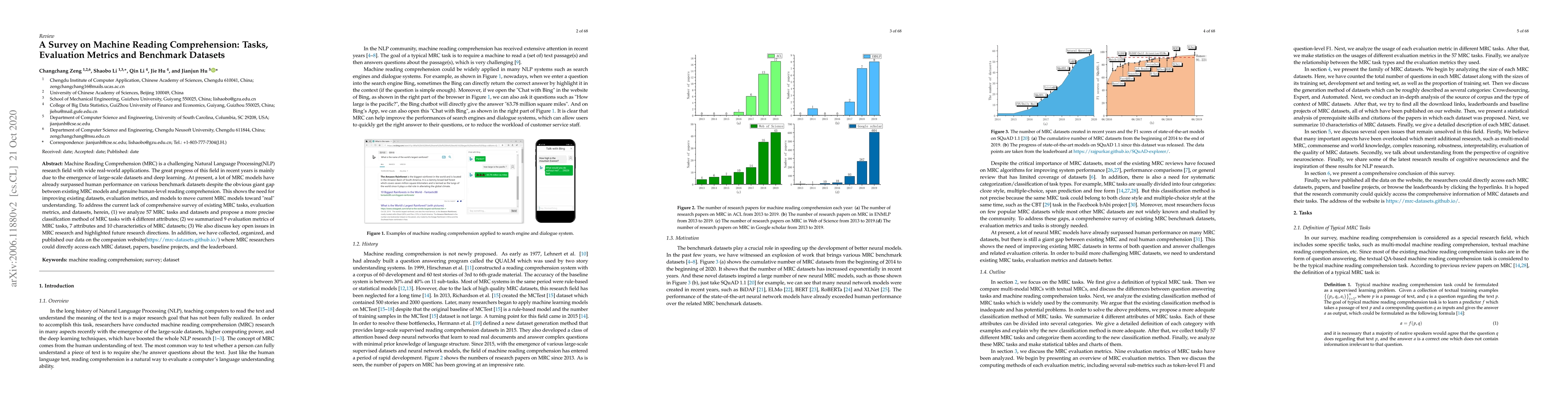 This paper surveys Machine Reading Comprehension (MRC), analyzing 57 MRC tasks and datasets to propose a refined classification method. It also summarizes 9 evaluation metrics and discusses key open issues, aiming to guide future research and improve MRC models towards genuine human-level comprehension.