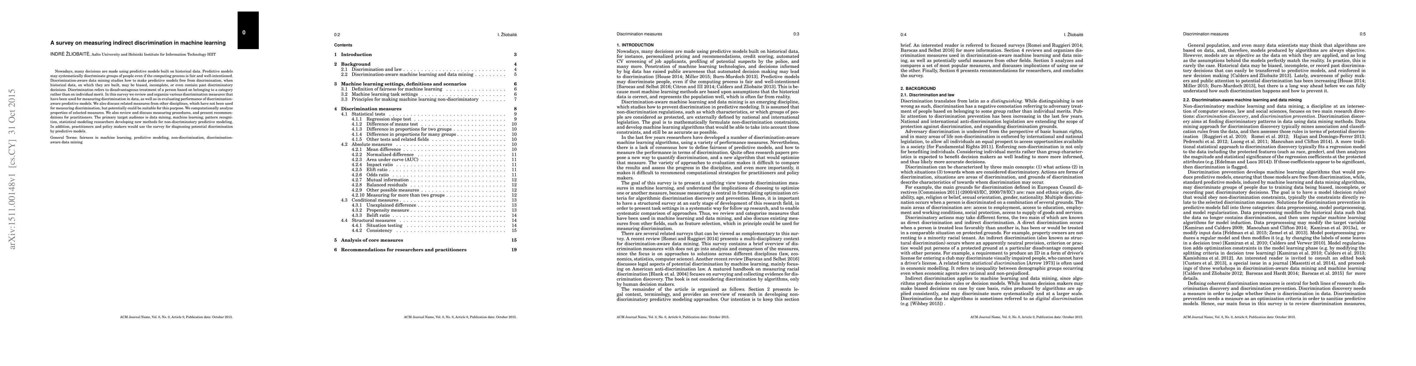 This paper surveys various measures for assessing indirect discrimination in machine learning models, reviewing both existing discrimination metrics and potential new measures from other disciplines. It provides recommendations for practitioners and policy makers to diagnose and mitigate discrimination in predictive models.