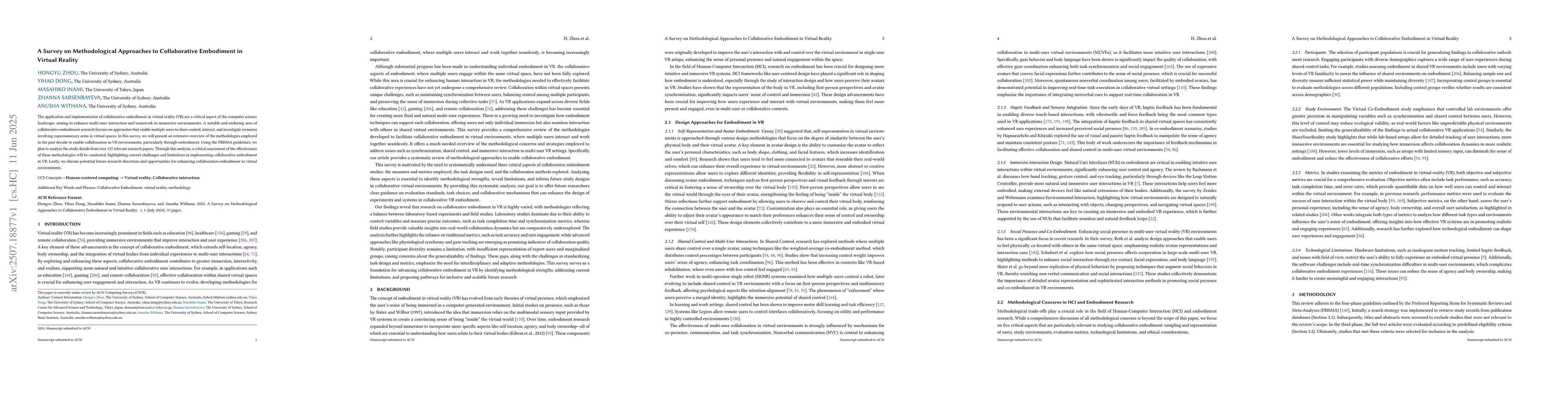 The application and implementation of collaborative embodiment in virtual reality (VR) are a critical aspect of the computer science landscape, aiming to enhance multi-user interaction and teamwork in immersive environments. A notable and enduring area of collaborative embodiment research focuses on approaches that enable multiple users to share control, interact, and investigate scenarios involving supernumerary arms in virtual spaces. In this survey, we will present an extensive overview of the methodologies employed in the past decade to enable collaboration in VR environments, particularly through embodiment. Using the PRISMA guidelines, we plan to analyze the study details from over 137 relevant research papers. Through this analysis, a critical assessment of the effectiveness of these methodologies will be conducted, highlighting current challenges and limitations in implementing collaborative embodiment in VR. Lastly, we discuss potential future research directions and opportunities for enhancing collaboration embodiment in virtual environments.