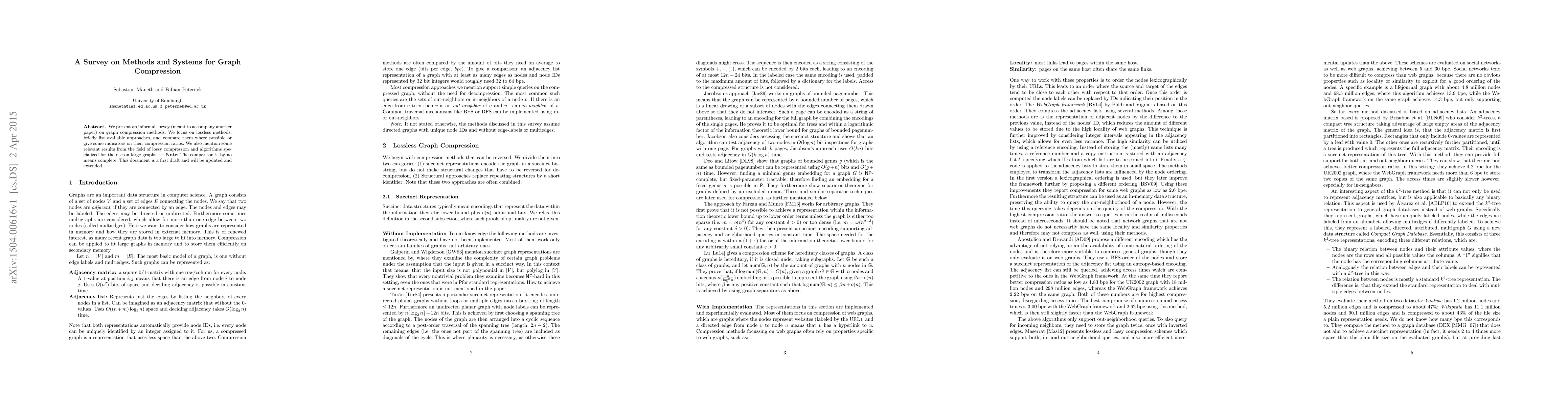 This paper provides an informal survey of lossless graph compression methods, briefly listing available approaches and comparing them based on their compression ratios. It also mentions relevant results from lossy compression and algorithms tailored for large graphs, though the comparison is incomplete and the document is a first draft.