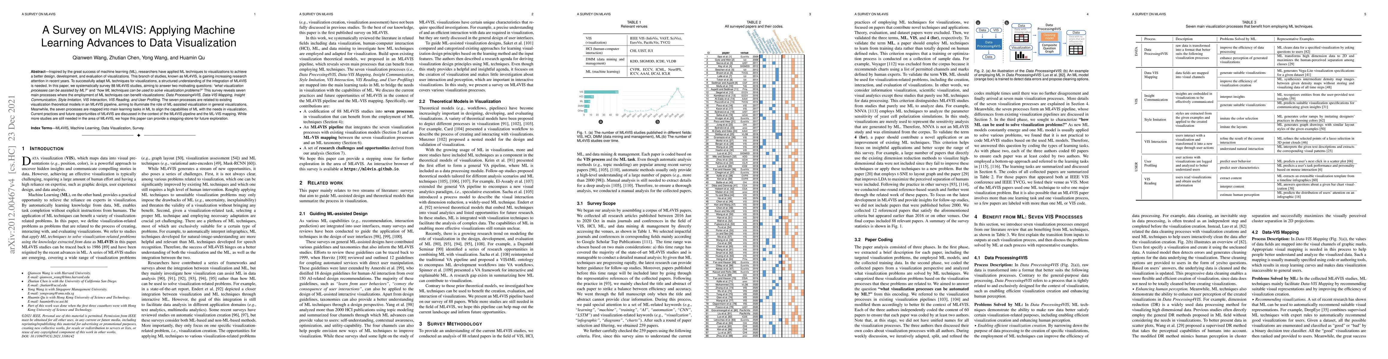 This study surveys 88 research papers on ML4VIS, a field that applies machine learning to improve data visualization, identifying seven main processes where ML can assist visualizations: Data Processing, Visualization Mapping, Style Imitation, and more.