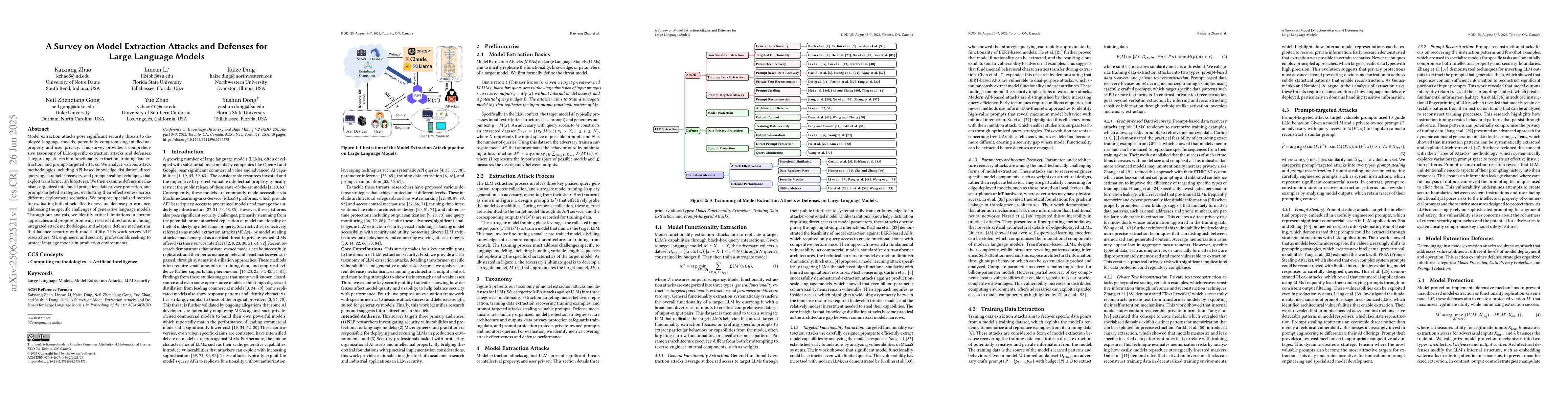 This survey provides a comprehensive taxonomy of LLM-specific extraction attacks and defenses, categorizing attacks into functionality extraction, training data extraction, and prompt-targeted attacks. It analyzes various attack methodologies and defense mechanisms, proposing specialized metrics for evaluation.