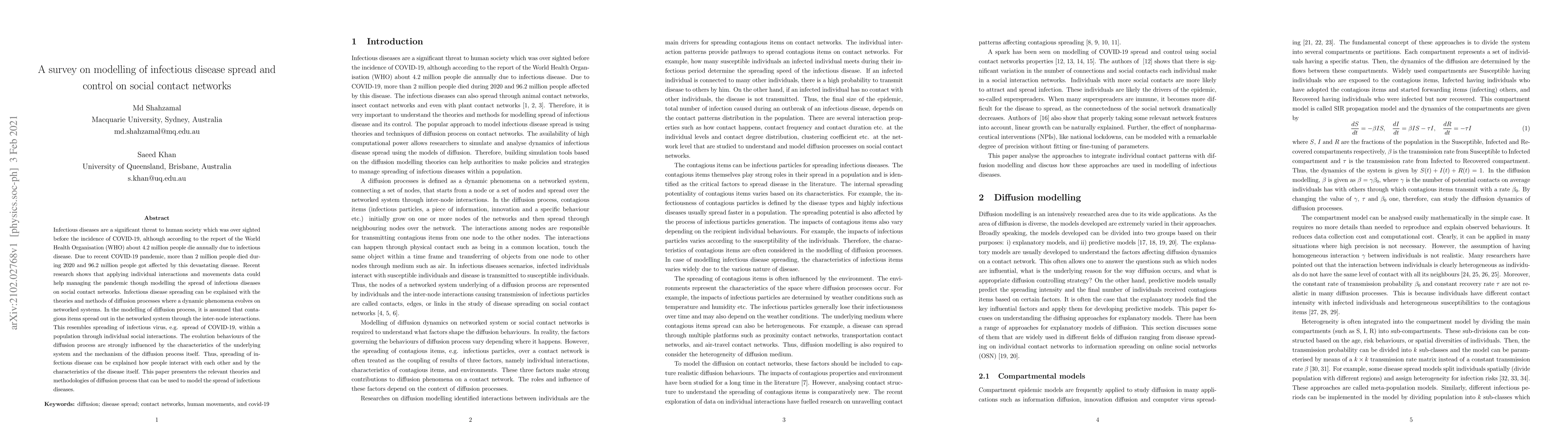 Infectious diseases are a significant threat to human society which was over sighted before the incidence of COVID-19, although according to the report of the World Health Organisation (WHO) about 4.2 million people die annually due to infectious disease. Due to recent COVID-19 pandemic, more than 2 million people died during 2020 and 96.2 million people got affected by this devastating disease. Recent research shows that applying individual interactions and movements data could help managing the pandemic though modelling the spread of infectious diseases on social contact networks. Infectious disease spreading can be explained with the theories and methods of diffusion processes where a dynamic phenomena evolves on networked systems. In the modelling of diffusion process, it is assumed that contagious items spread out in the networked system through the inter-node interactions. This resembles spreading of infectious virus, e.g. spread of COVID-19, within a population through individual social interactions. The evolution behaviours of the diffusion process are strongly influenced by the characteristics of the underlying system and the mechanism of the diffusion process itself. Thus, spreading of infectious disease can be explained how people interact with each other and by the characteristics of the disease itself. This paper presenters the relevant theories and methodologies of diffusion process that can be used to model the spread of infectious diseases.