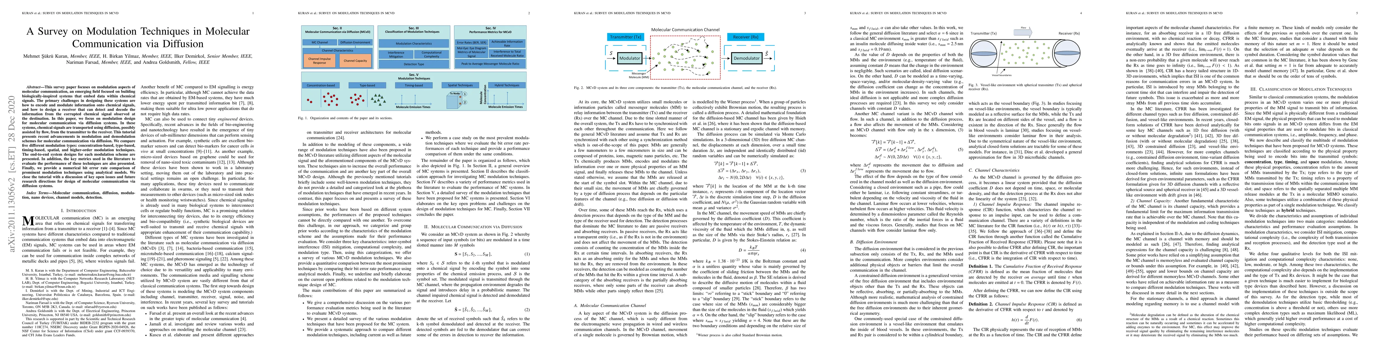 This paper surveys modulation techniques for molecular communication via diffusion, comparing five types: concentration-based, type-based, timing-based, spatial, and higher-order. It evaluates performance metrics and provides a numerical bit error rate comparison, concluding with open issues and future research directions.