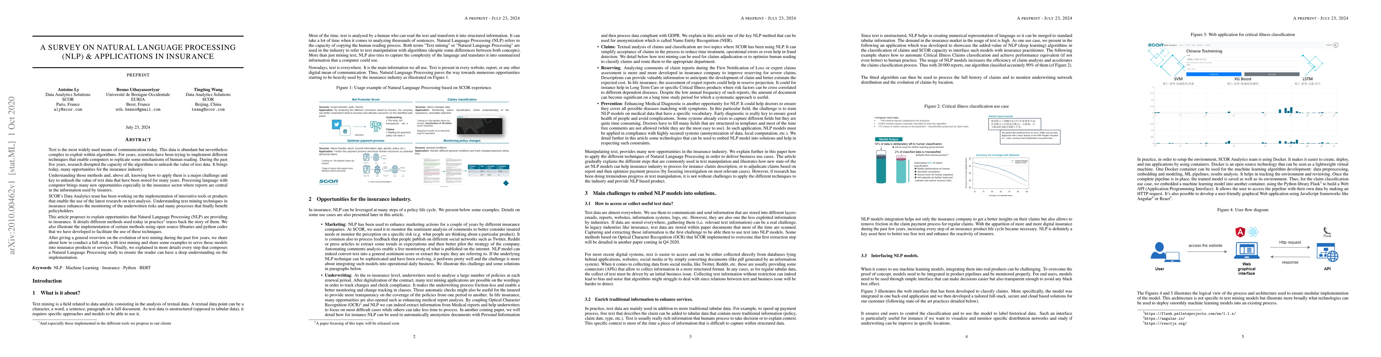 Text is the most widely used means of communication today. This data is abundant but nevertheless complex to exploit within algorithms. For years, scientists have been trying to implement different techniques that enable computers to replicate some mechanisms of human reading. During the past five years, research disrupted the capacity of the algorithms to unleash the value of text data. It brings today, many opportunities for the insurance industry.Understanding those methods and, above all, knowing how to apply them is a major challenge and key to unleash the value of text data that have been stored for many years. Processing language with computer brings many new opportunities especially in the insurance sector where reports are central in the information used by insurers. SCOR's Data Analytics team has been working on the implementation of innovative tools or products that enable the use of the latest research on text analysis. Understanding text mining techniques in insurance enhances the monitoring of the underwritten risks and many processes that finally benefit policyholders.This article proposes to explain opportunities that Natural Language Processing (NLP) are providing to insurance. It details different methods used today in practice traces back the story of them. We also illustrate the implementation of certain methods using open source libraries and python codes that we have developed to facilitate the use of these techniques.After giving a general overview on the evolution of text mining during the past few years,we share about how to conduct a full study with text mining and share some examples to serve those models into insurance products or services. Finally, we explained in more details every step that composes a Natural Language Processing study to ensure the reader can have a deep understanding on the implementation.
