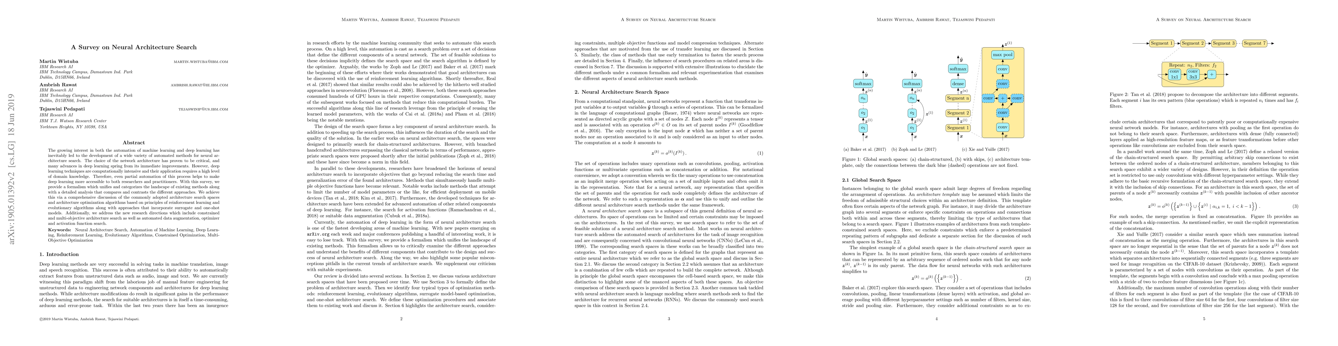 This survey categorizes and analyzes various automated neural architecture search methods, highlighting their optimization algorithms and search spaces. It also explores emerging research directions like constrained and multi-objective search, and automated data augmentation, optimizer, and activation function search.