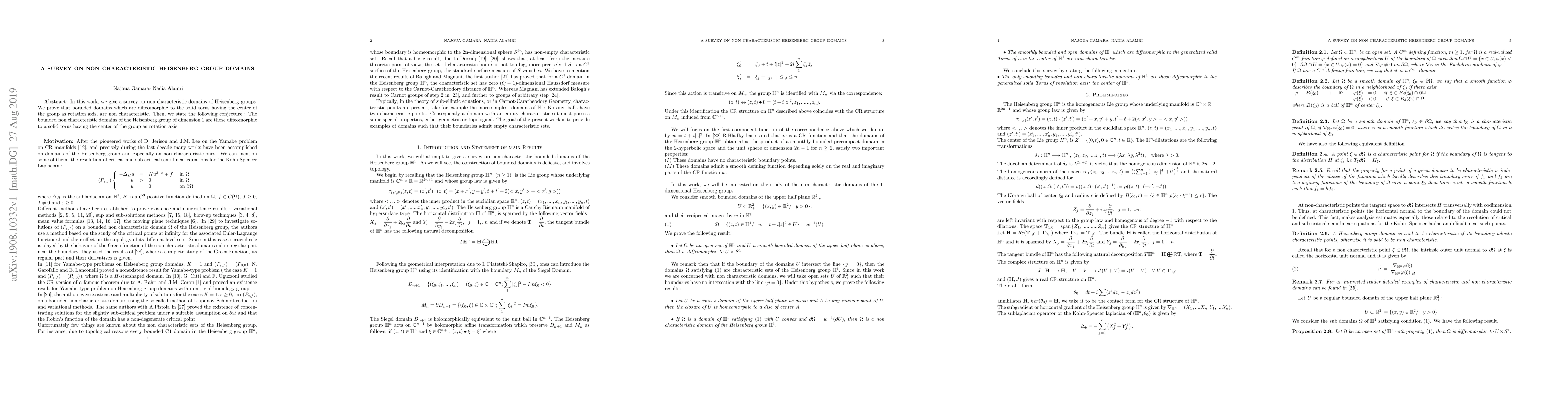 In this work, we give a survey on non characteristic domains of Heisenberg groups. We prove that bounded domains which are diffeomorphic to the solid torus having the center of the group as rotation axis, are non characteristic. Then, we state the following conjecture : The bounded non characteristic domains of the Heisenberg group of dimension 1 are those diffeomorphic to a solid torus having the center of the group as rotation axis.