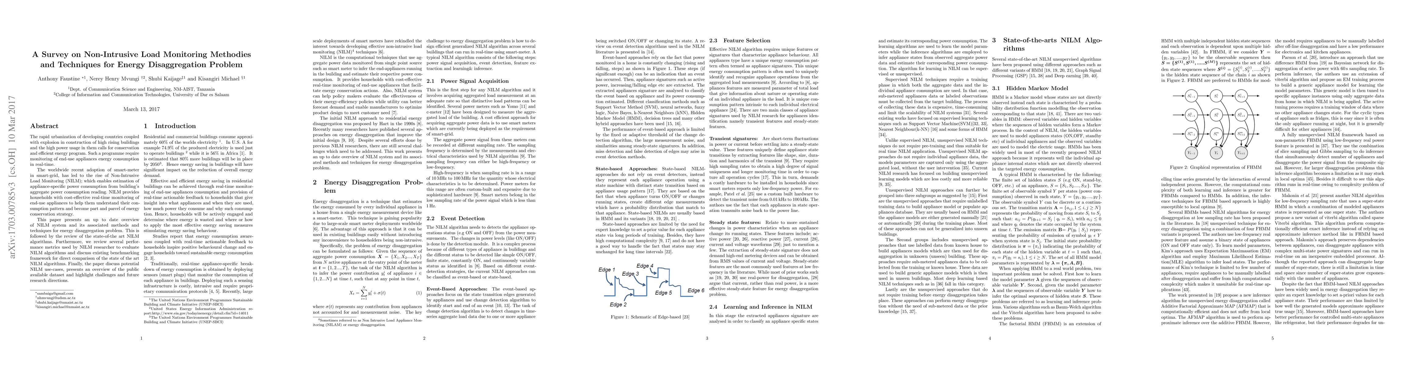 This paper surveys Non-Intrusive Load Monitoring (NILM) techniques for disaggregating energy consumption of individual appliances from aggregate readings, reviewing state-of-the-art algorithms and performance metrics, and discussing potential applications, datasets, and future research directions.