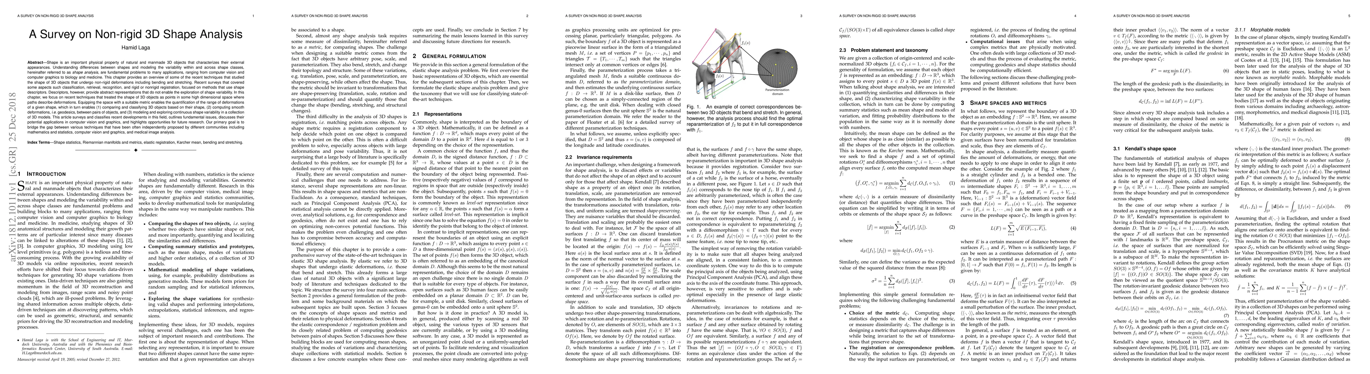 This paper surveys recent techniques for non-rigid 3D shape analysis, focusing on methods that model shape deformations in high-dimensional spaces. It aims to bridge gaps between different research communities and highlights applications in computer vision, graphics, and medical imaging.