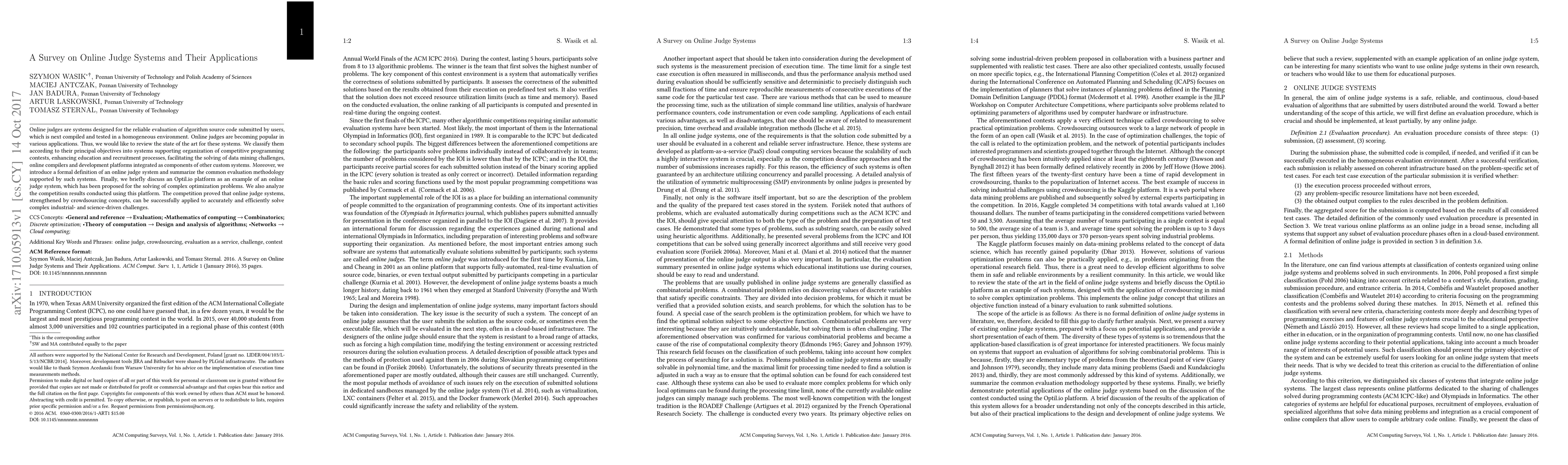 This paper reviews online judge systems, classifying them by their primary objectives, including competitive programming, education, recruitment, and data mining. It also introduces a formal definition, common evaluation methodologies, and analyzes the Optil.io platform, demonstrating their effectiveness in solving complex optimization problems through competition results.