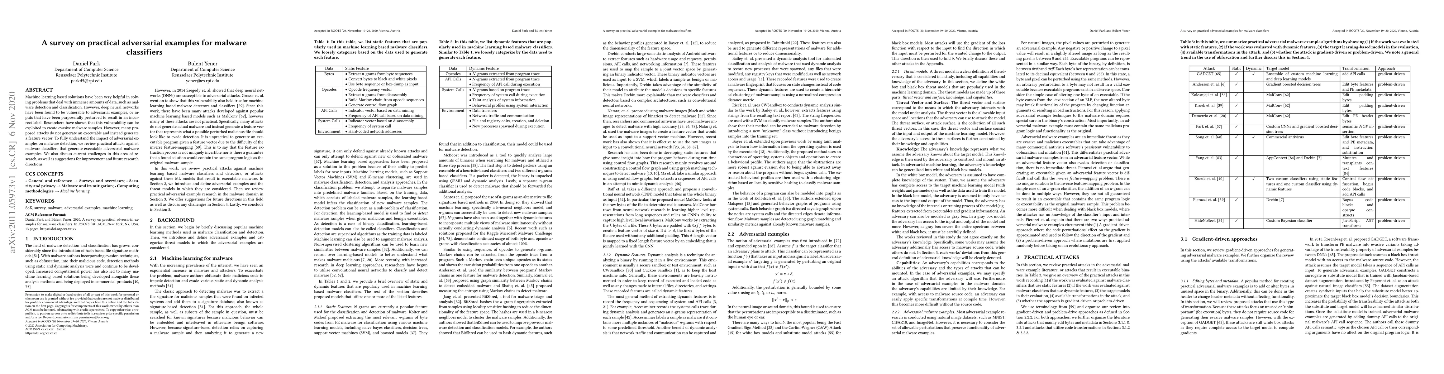 This paper surveys practical adversarial examples targeting malware classifiers, focusing on attacks that generate executable malware. It highlights current challenges and suggests future research directions to improve robustness against such attacks.