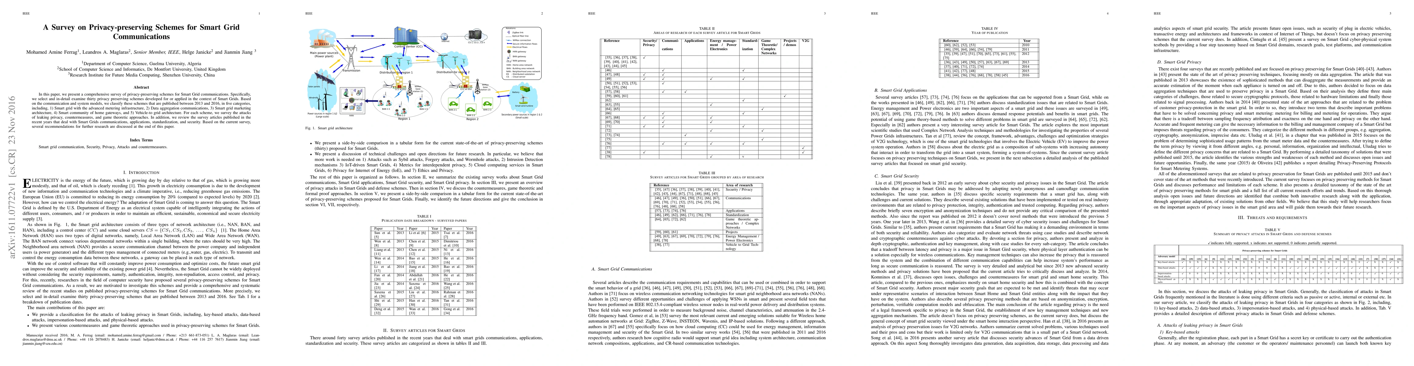 This paper surveys thirty privacy-preserving schemes for Smart Grid communications, categorizing them into five groups based on communication and system models. It reviews attacks, countermeasures, and game theoretic approaches, and provides recommendations for further research.