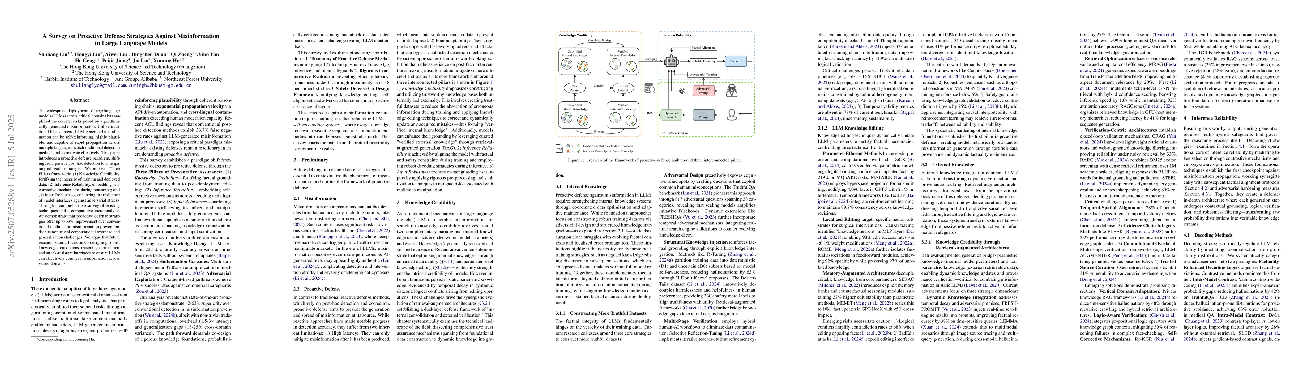 The widespread deployment of large language models (LLMs) across critical domains has amplified the societal risks posed by algorithmically generated misinformation. Unlike traditional false content, LLM-generated misinformation can be self-reinforcing, highly plausible, and capable of rapid propagation across multiple languages, which traditional detection methods fail to mitigate effectively. This paper introduces a proactive defense paradigm, shifting from passive post hoc detection to anticipatory mitigation strategies. We propose a Three Pillars framework: (1) Knowledge Credibility, fortifying the integrity of training and deployed data; (2) Inference Reliability, embedding self-corrective mechanisms during reasoning; and (3) Input Robustness, enhancing the resilience of model interfaces against adversarial attacks. Through a comprehensive survey of existing techniques and a comparative meta-analysis, we demonstrate that proactive defense strategies offer up to 63\% improvement over conventional methods in misinformation prevention, despite non-trivial computational overhead and generalization challenges. We argue that future research should focus on co-designing robust knowledge foundations, reasoning certification, and attack-resistant interfaces to ensure LLMs can effectively counter misinformation across varied domains.