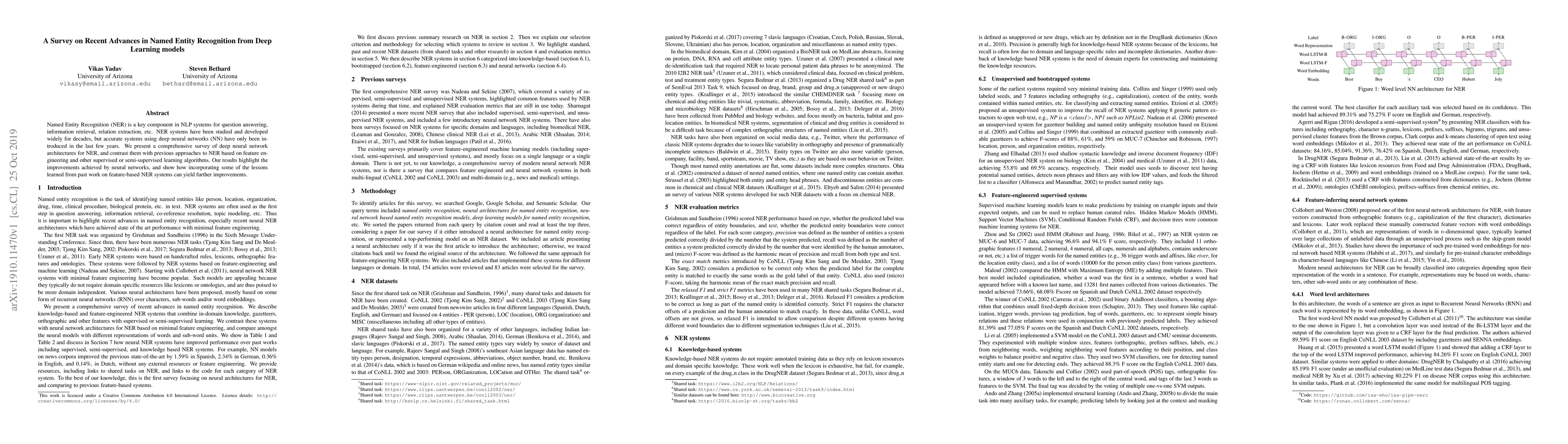 This paper surveys recent advances in Named Entity Recognition (NER) using deep learning models, comparing them to traditional feature-based methods and highlighting the significant improvements achieved by neural networks. It also discusses how integrating insights from past feature-based NER systems can further enhance deep learning approaches.