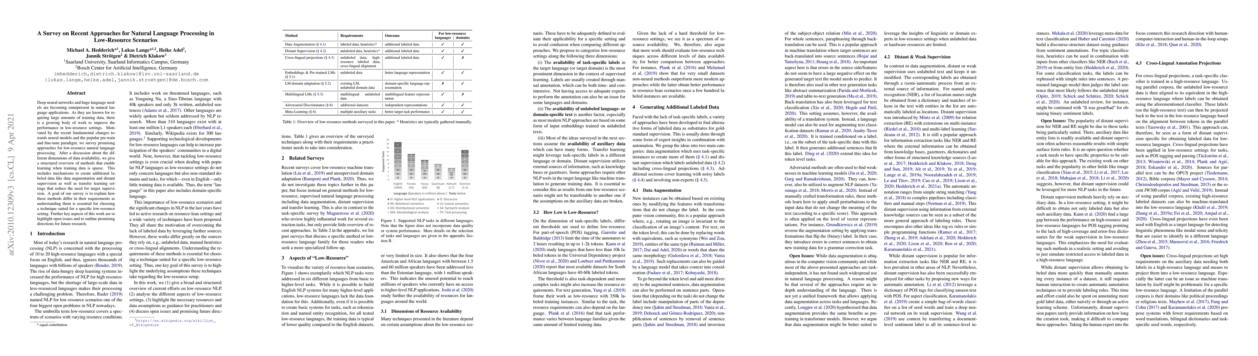 This paper surveys recent advancements in natural language processing for low-resource settings, focusing on methods like data augmentation, distant supervision, and transfer learning that enable effective learning with limited data. The study aims to clarify the differences in requirements among these techniques to guide their application in specific scenarios, while also identifying open issues and future research directions.