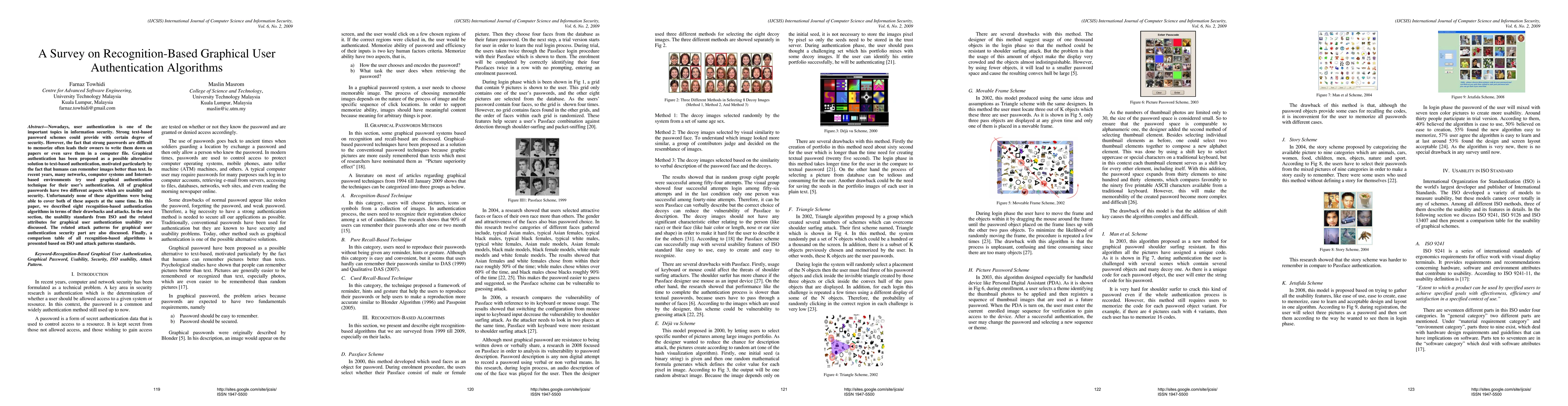 This paper surveys eight recognition-based graphical user authentication algorithms, analyzing their drawbacks, attacks, and usability in relation to ISO standards.