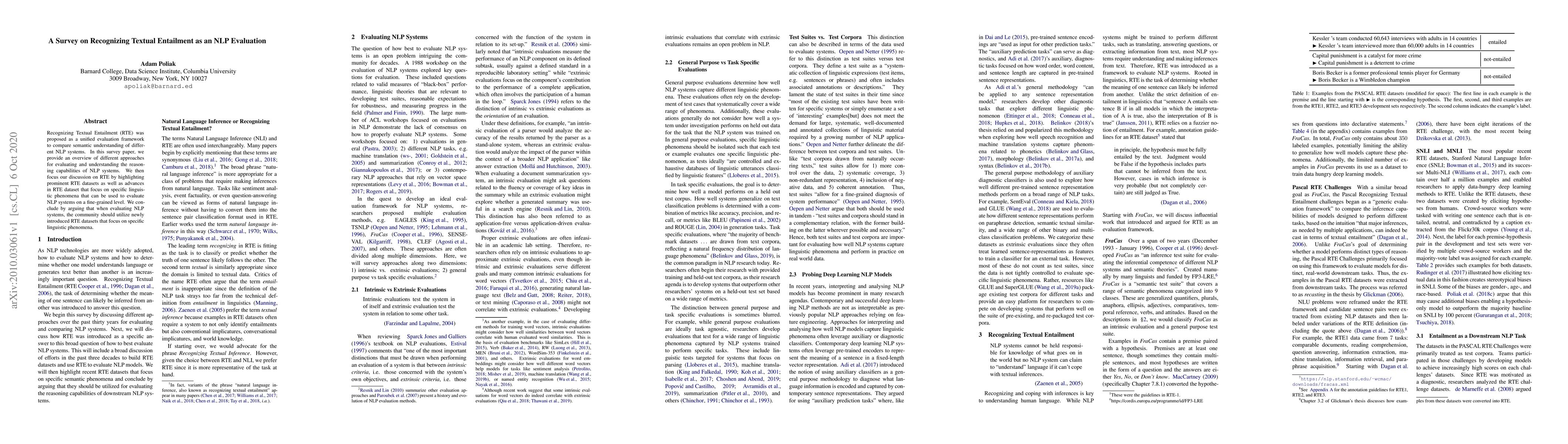 Recognizing Textual Entailment (RTE) was proposed as a unified evaluation framework to compare semantic understanding of different NLP systems. In this survey paper, we provide an overview of different approaches for evaluating and understanding the reasoning capabilities of NLP systems. We then focus our discussion on RTE by highlighting prominent RTE datasets as well as advances in RTE dataset that focus on specific linguistic phenomena that can be used to evaluate NLP systems on a fine-grained level. We conclude by arguing that when evaluating NLP systems, the community should utilize newly introduced RTE datasets that focus on specific linguistic phenomena.