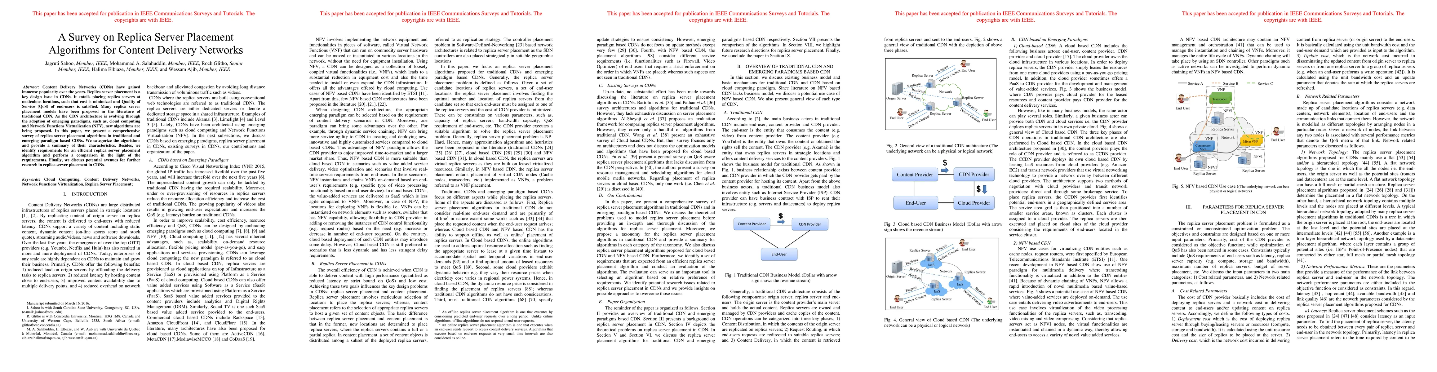 This paper conducts a thorough survey of replica server placement algorithms for Content Delivery Networks (CDNs), categorizing existing models for traditional CDNs and emerging paradigms like cloud computing and Network Functions Virtualization (NFV), and highlighting avenues for future research. It identifies key requirements for effective algorithms and compares them accordingly.