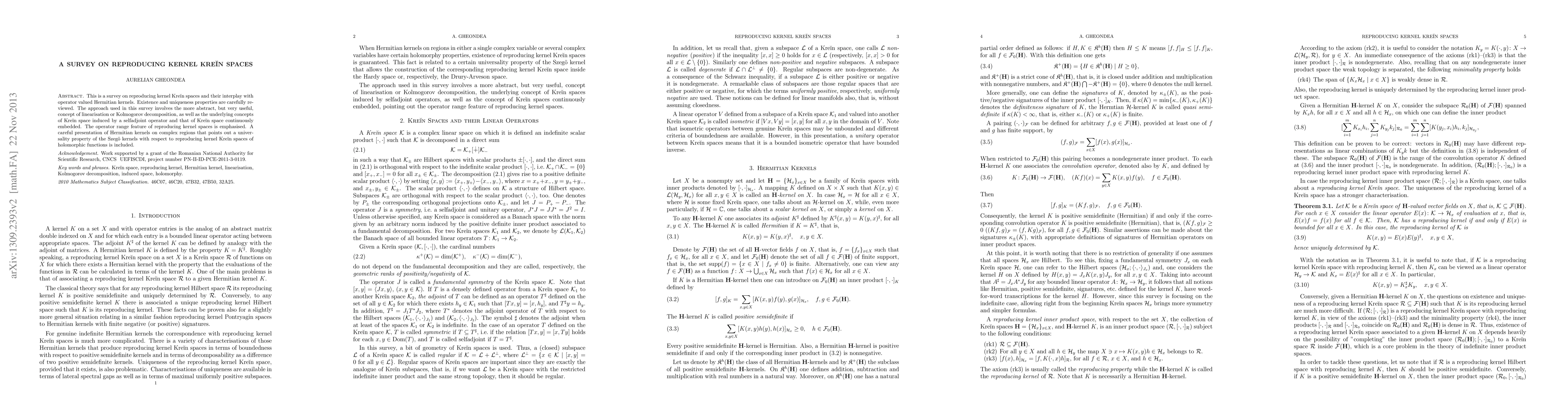 This survey explores the existence and uniqueness properties of reproducing kernel Krein spaces, emphasizing the operator range feature and the interplay with operator-valued Hermitian kernels. It utilizes linearization and Kolmogorov decomposition, highlighting the universality of Szego kernels in these spaces.