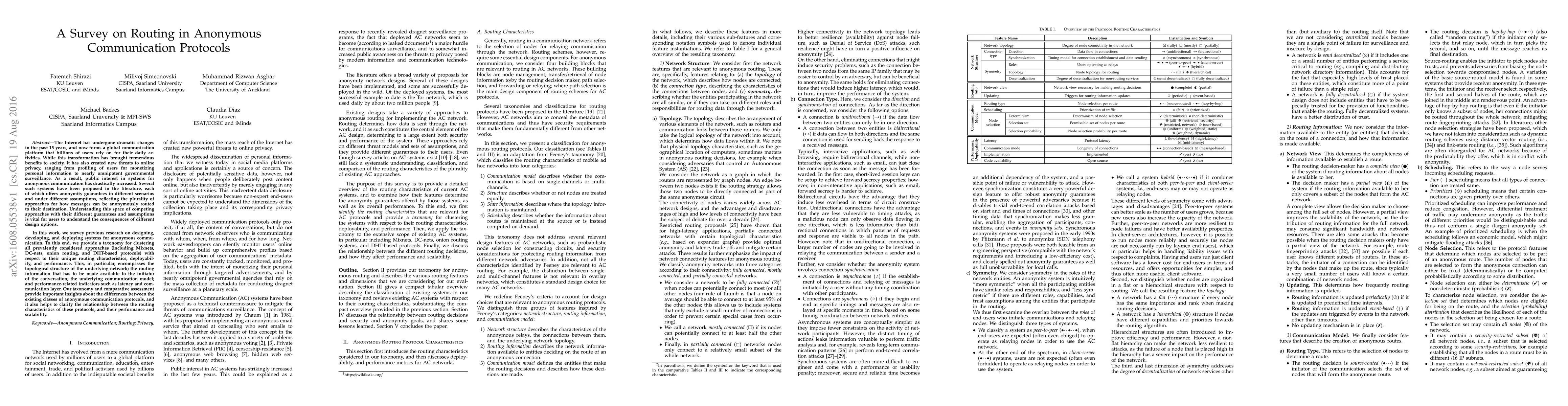 This paper surveys various anonymous communication protocols, categorizing them based on routing characteristics, deployability, and performance. It provides a taxonomy that compares systems like Mixnets, DC-nets, onion routing, and DHT-based protocols, offering insights into their differences and the trade-offs between routing, performance, and scalability.