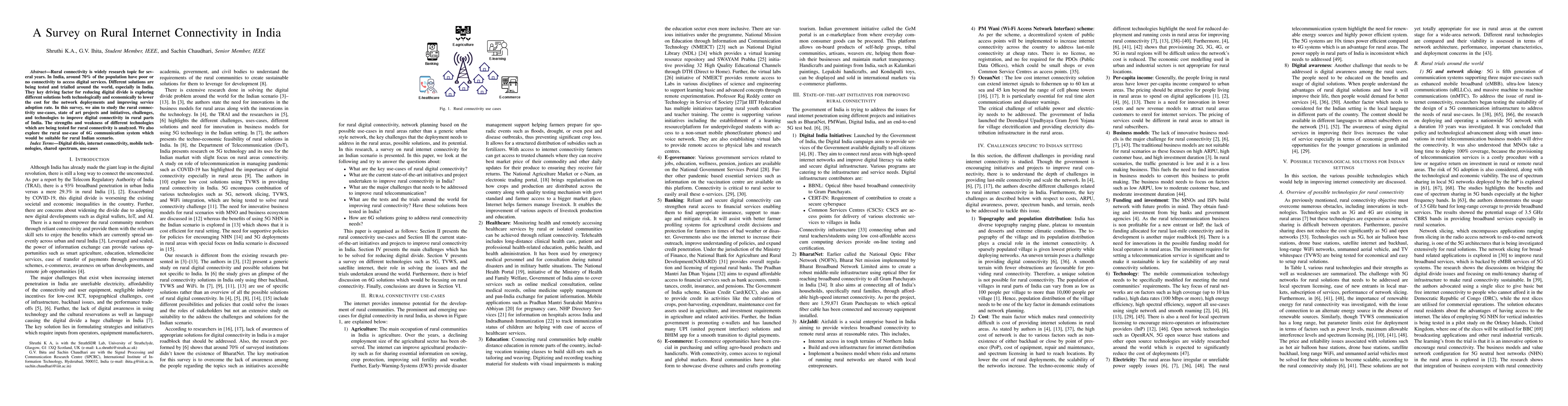 This paper surveys rural internet connectivity in India, focusing on current use-cases, state-of-the-art projects, challenges, and technologies. It analyzes the strengths and weaknesses of various solutions, including the potential of 6G for rural connectivity.