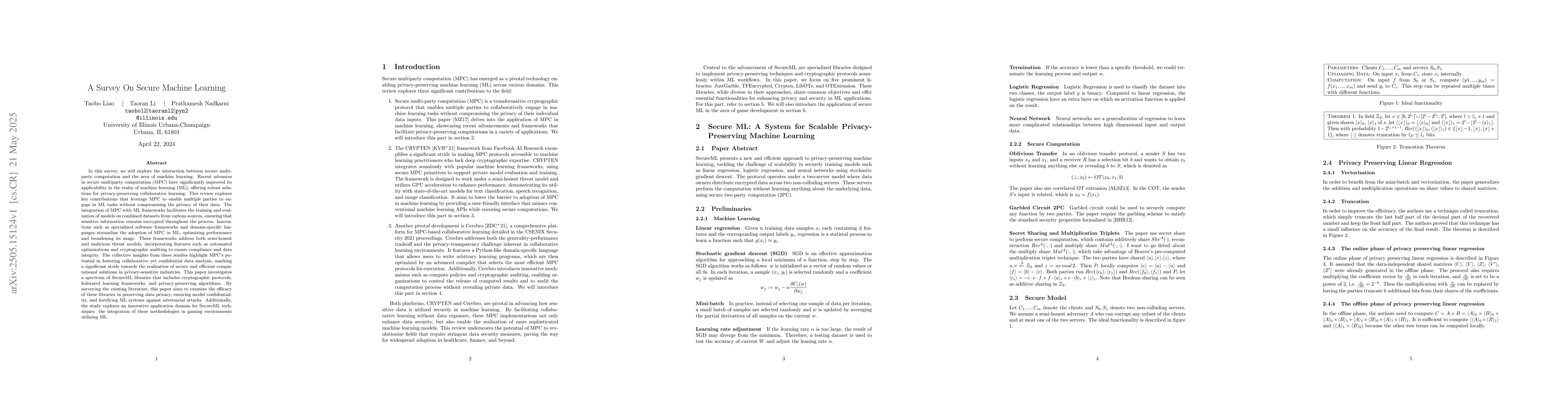 In this survey, we will explore the interaction between secure multiparty computation and the area of machine learning. Recent advances in secure multiparty computation (MPC) have significantly improved its applicability in the realm of machine learning (ML), offering robust solutions for privacy-preserving collaborative learning. This review explores key contributions that leverage MPC to enable multiple parties to engage in ML tasks without compromising the privacy of their data. The integration of MPC with ML frameworks facilitates the training and evaluation of models on combined datasets from various sources, ensuring that sensitive information remains encrypted throughout the process. Innovations such as specialized software frameworks and domain-specific languages streamline the adoption of MPC in ML, optimizing performance and broadening its usage. These frameworks address both semi-honest and malicious threat models, incorporating features such as automated optimizations and cryptographic auditing to ensure compliance and data integrity. The collective insights from these studies highlight MPC's potential in fostering collaborative yet confidential data analysis, marking a significant stride towards the realization of secure and efficient computational solutions in privacy-sensitive industries. This paper investigates a spectrum of SecureML libraries that includes cryptographic protocols, federated learning frameworks, and privacy-preserving algorithms. By surveying the existing literature, this paper aims to examine the efficacy of these libraries in preserving data privacy, ensuring model confidentiality, and fortifying ML systems against adversarial attacks. Additionally, the study explores an innovative application domain for SecureML techniques: the integration of these methodologies in gaming environments utilizing ML.