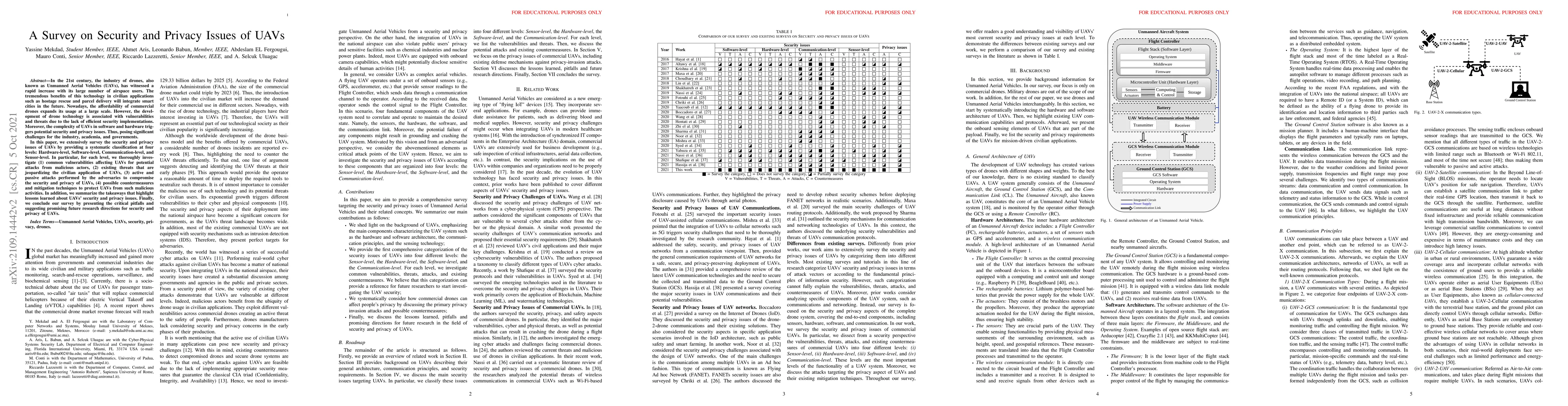 This paper provides a comprehensive survey of security and privacy issues associated with Unmanned Aerial Vehicles (UAVs), classifying vulnerabilities and threats at four levels: hardware, software, communication, and sensor. It examines common vulnerabilities, existing threats, active and passive attacks, and potential countermeasures, concluding with critical challenges and future research directions in UAV security and privacy.