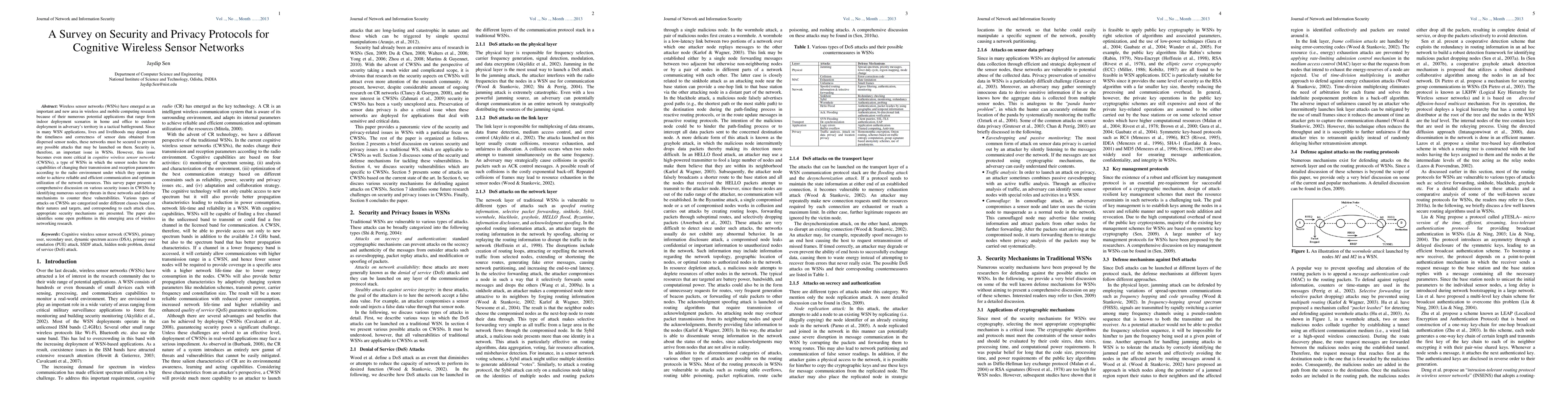 This survey paper provides a comprehensive overview of security and privacy protocols for cognitive wireless sensor networks (CWSNs), identifying various security threats and corresponding defense mechanisms, while also highlighting open issues in this evolving research area.