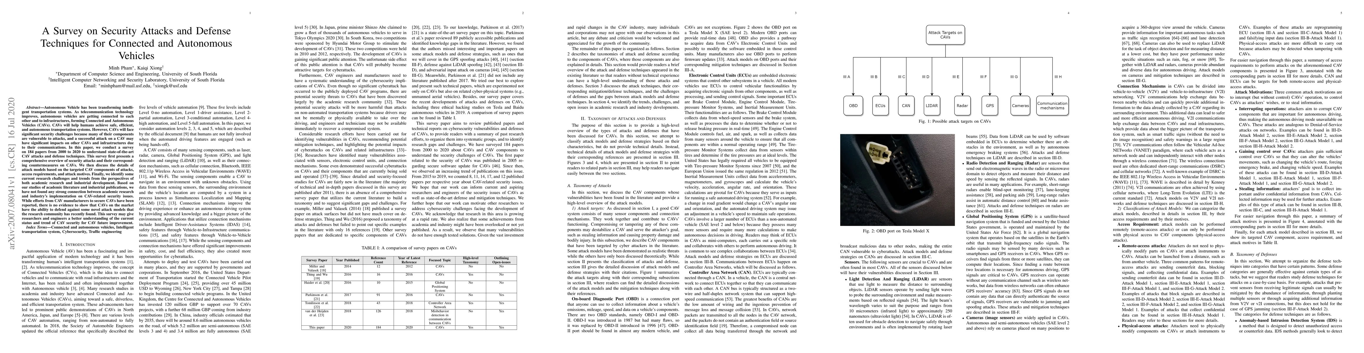 This paper surveys 184 papers to analyze security attacks and defense techniques for Connected and Autonomous Vehicles (CAVs), highlighting significant vulnerabilities and the lack of alignment between academic research and industry implementations. It identifies current research challenges and trends, noting the absence of robust defense mechanisms in current market vehicles against novel attack models.