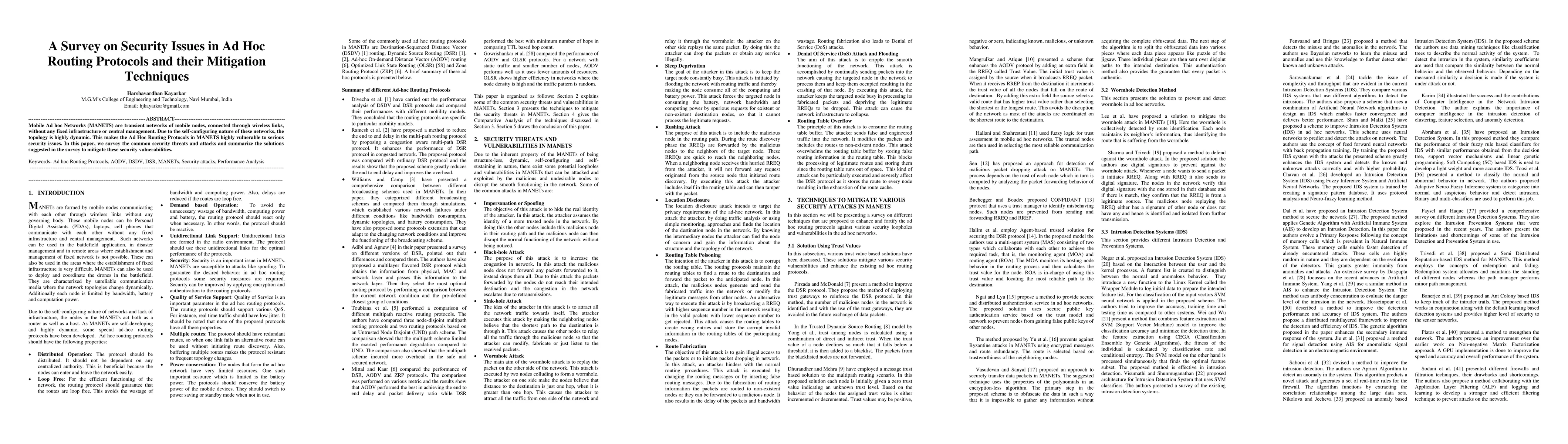Mobile Ad hoc Networks (MANETS) are transient networks of mobile nodes, connected through wireless links, without any fixed infrastructure or central management. Due to the self-configuring nature of these networks, the topology is highly dynamic. This makes the Ad Hoc Routing Protocols in MANETS highly vulnerable to serious security issues. In this paper, we survey the common security threats and attacks and summarize the solutions suggested in the survey to mitigate these security vulnerabilities.