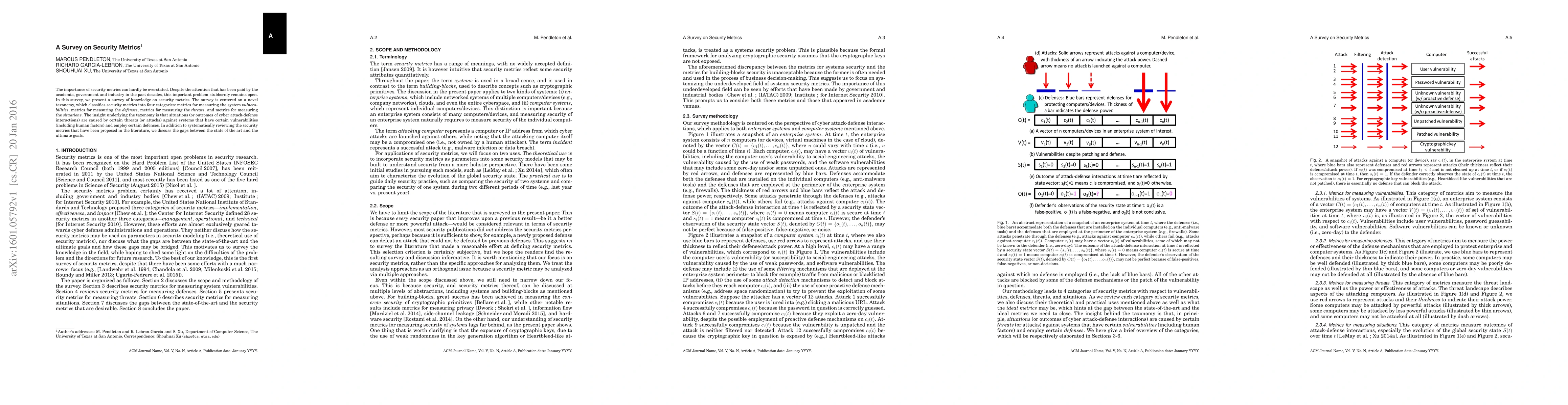 This paper surveys security metrics, categorizing them into four types: vulnerabilities, defenses, threats, and situations. The study highlights gaps between current metrics and ideal goals, aiming to advance the field of cybersecurity.