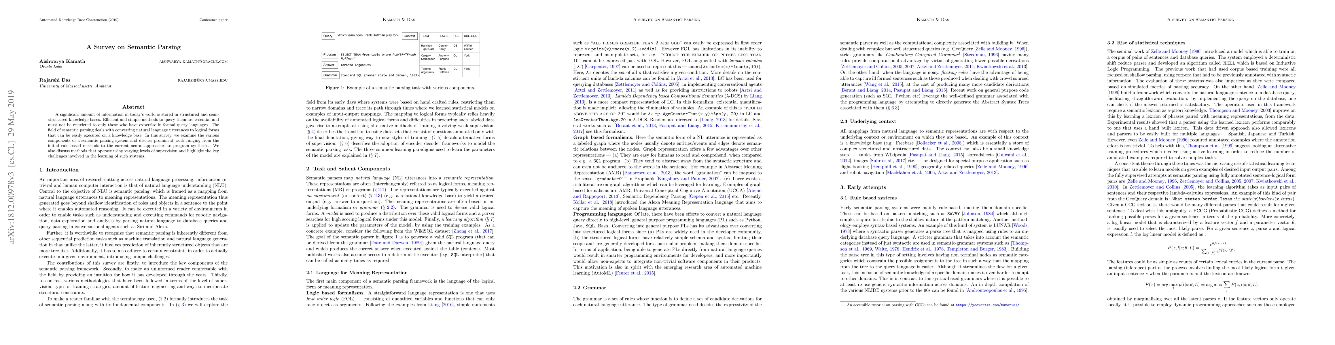 This survey explores the evolution of semantic parsing, from rule-based methods to neural approaches, focusing on converting natural language queries into executable forms for knowledge bases. It highlights various levels of supervision and discusses the key challenges in learning these systems.