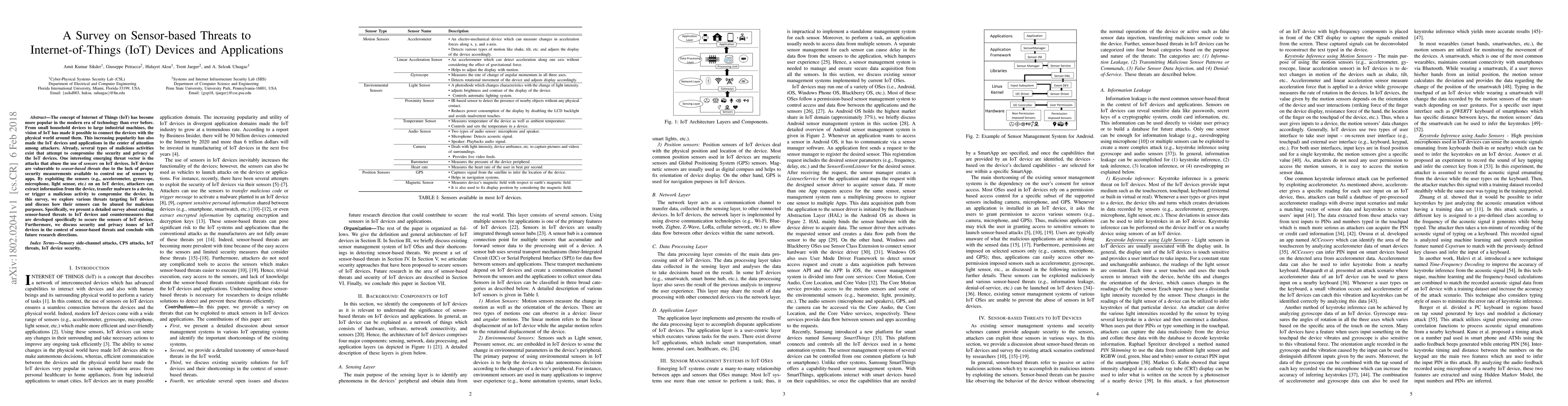This paper provides a comprehensive survey on sensor-based threats to IoT devices, exploring various attack vectors targeting sensors like accelerometer, gyroscope, microphone, and light sensor, and discussing countermeasures.