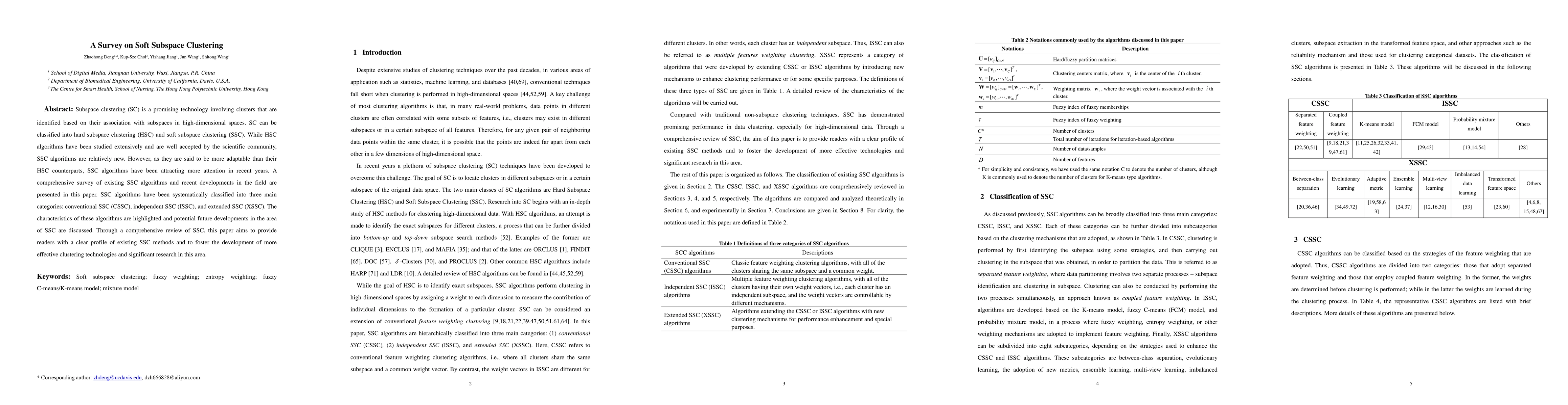 This paper surveys existing soft subspace clustering algorithms, categorizing them into three main types: conventional, independent, and extended SSC. It highlights their characteristics and discusses future development potential in this emerging field of clustering technology.