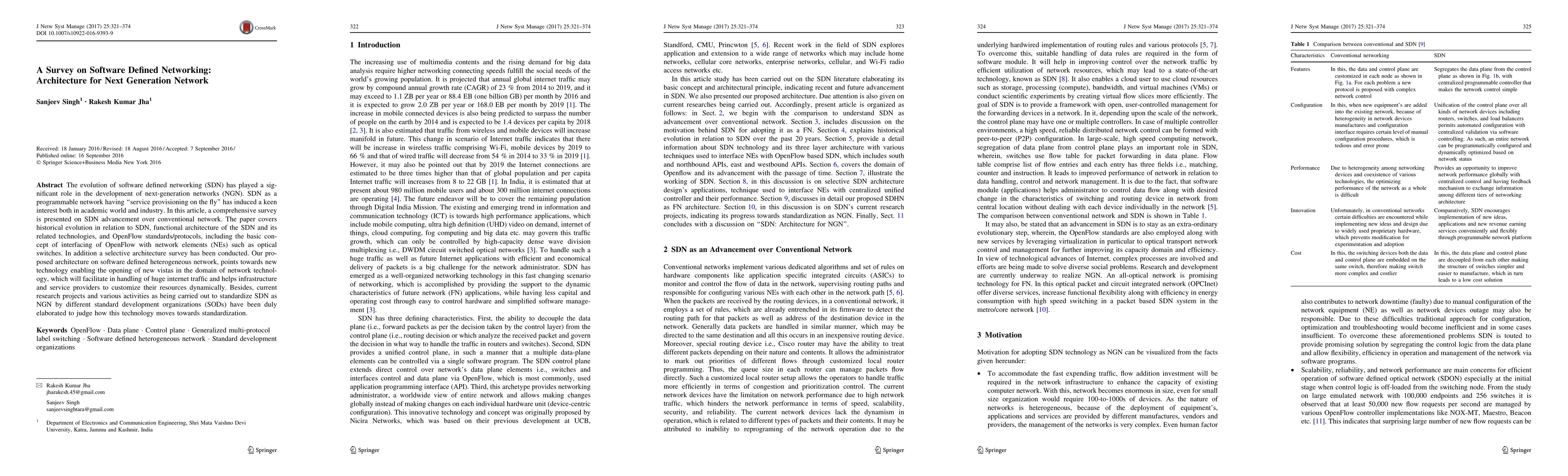 The evolution of software defined networking (SDN) has played a significant role in the development of next-generation networks (NGN). SDN as a programmable network having service provisioning on the fly has induced a keen interest both in academic world and industry. In this article, a comprehensive survey is presented on SDN advancement over conventional network. The paper covers historical evolution in relation to SDN, functional architecture of the SDN and its related technologies, and OpenFlow standards/protocols, including the basic concept of interfacing of OpenFlow with network elements (NEs) such as optical switches. In addition a selective architecture survey has been conducted. Our proposed architecture on software defined heterogeneous network, points towards new technology enabling the opening of new vistas in the domain of network technology, which will facilitate in handling of huge internet traffic and helps infrastructure and service providers to customize their resources dynamically. Besides, current research projects and various activities as being carried out to standardize SDN as NGN by different standard development organizations (SODs) have been duly elaborated to judge how this technology moves towards standardization.