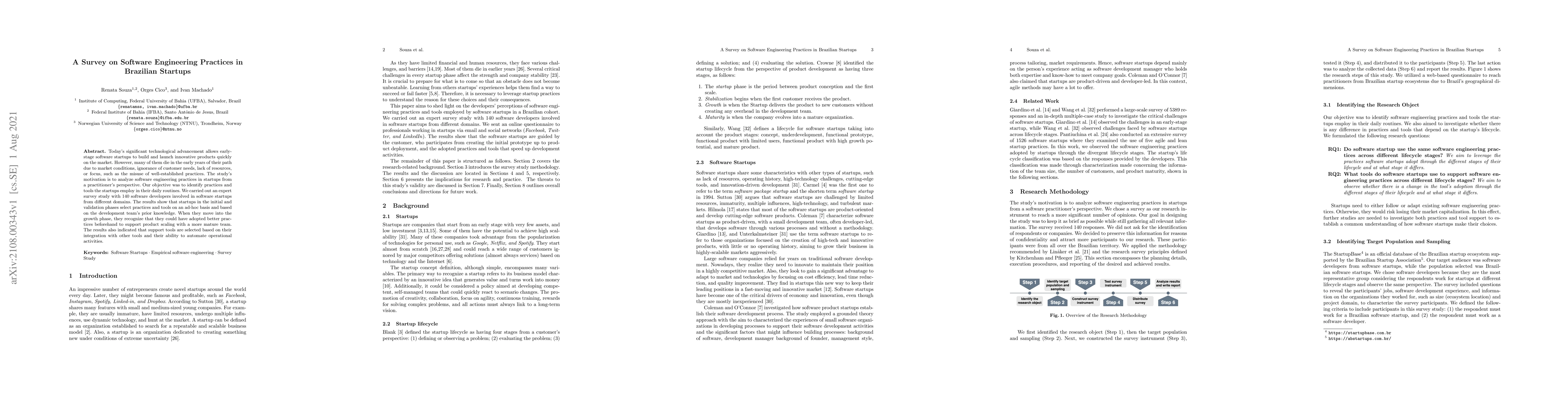 This study surveys software engineering practices among Brazilian startups, finding that early-stage teams often choose practices and tools based on prior knowledge, while growth-phase teams regret not adopting better practices earlier. Tool selection prioritizes integration and automation capabilities.