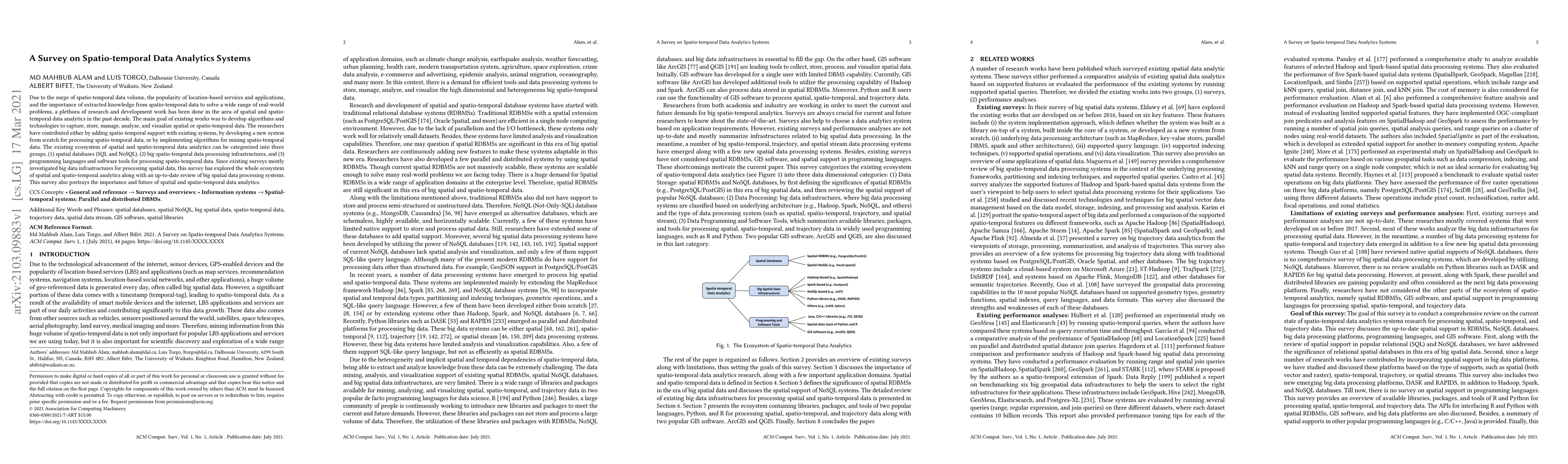 This paper provides a comprehensive survey of spatio-temporal data analytics systems, categorizing them into spatial databases, big data processing infrastructures, and specialized software tools. It highlights the importance of these systems in extracting knowledge to solve real-world problems and discusses future directions in the field.