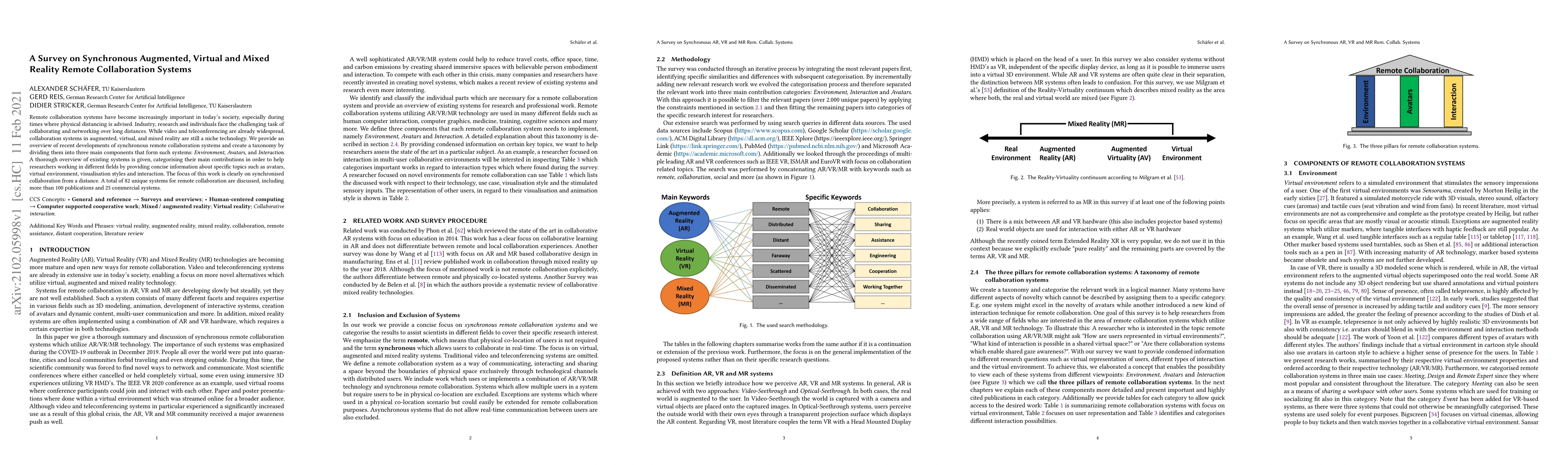 This paper surveys recent advancements in synchronous remote collaboration systems for augmented, virtual, and mixed reality, categorizing them into Environment, Avatars, and Interaction components. It provides an overview of 82 unique systems and over 100 publications to aid researchers across various fields.