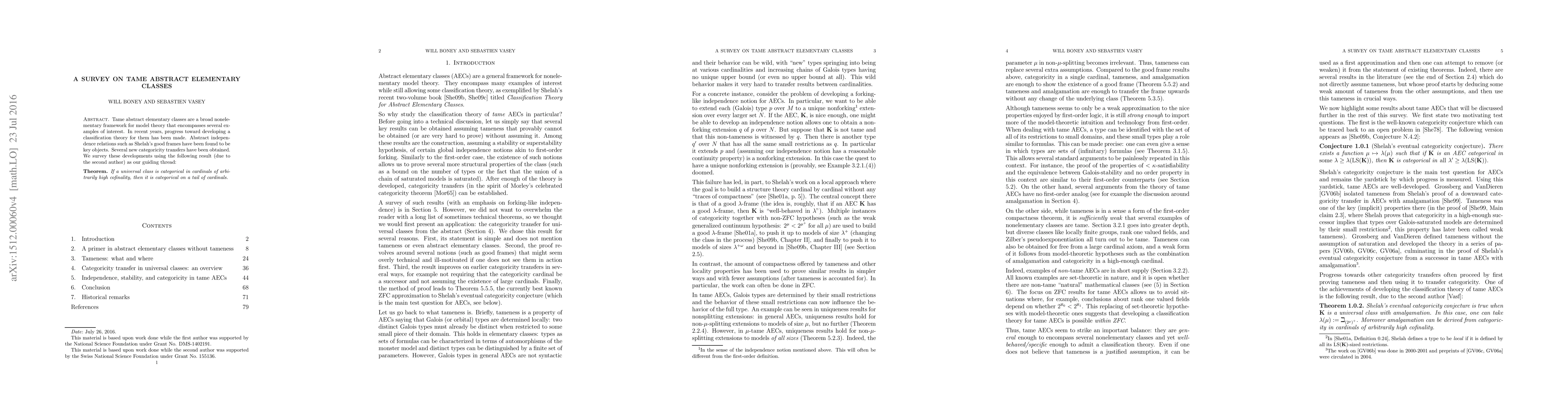 Tame abstract elementary classes are a broad nonelementary framework for model theory that encompasses several examples of interest. In recent years, progress toward developing a classification theory for them have been made. Abstract independence relations such as Shelah's good frames have been found to be key objects. Several new categoricity transfers have been obtained. We survey these developments using the following result (due to the second author) as our guiding thread: $\mathbf{Theorem}$ If a universal class is categorical in cardinals of arbitrarily high cofinality, then it is categorical on a tail of cardinals.