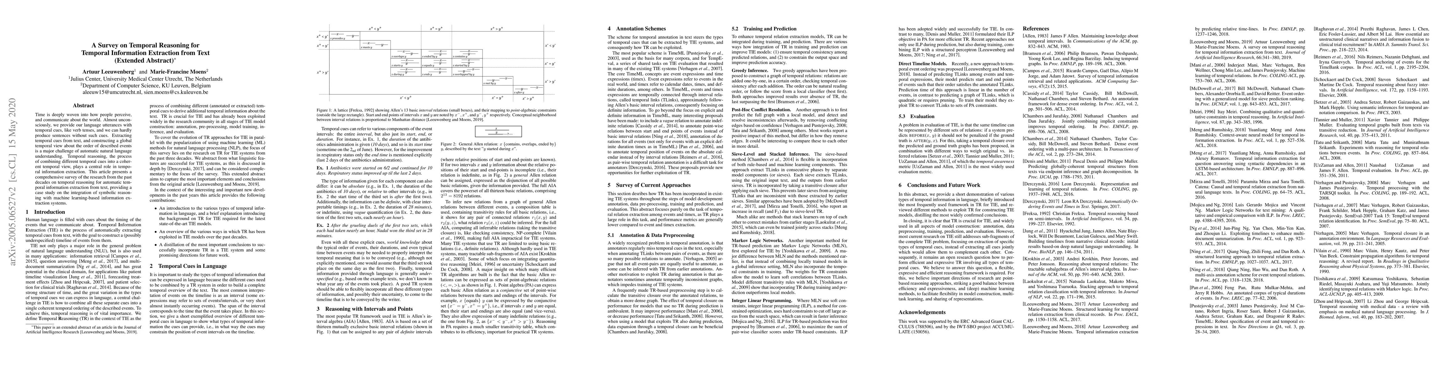 Time is deeply woven into how people perceive, and communicate about the world. Almost unconsciously, we provide our language utterances with temporal cues, like verb tenses, and we can hardly produce sentences without such cues. Extracting temporal cues from text, and constructing a global temporal view about the order of described events is a major challenge of automatic natural language understanding. Temporal reasoning, the process of combining different temporal cues into a coherent temporal view, plays a central role in temporal information extraction. This article presents a comprehensive survey of the research from the past decades on temporal reasoning for automatic temporal information extraction from text, providing a case study on the integration of symbolic reasoning with machine learning-based information extraction systems.