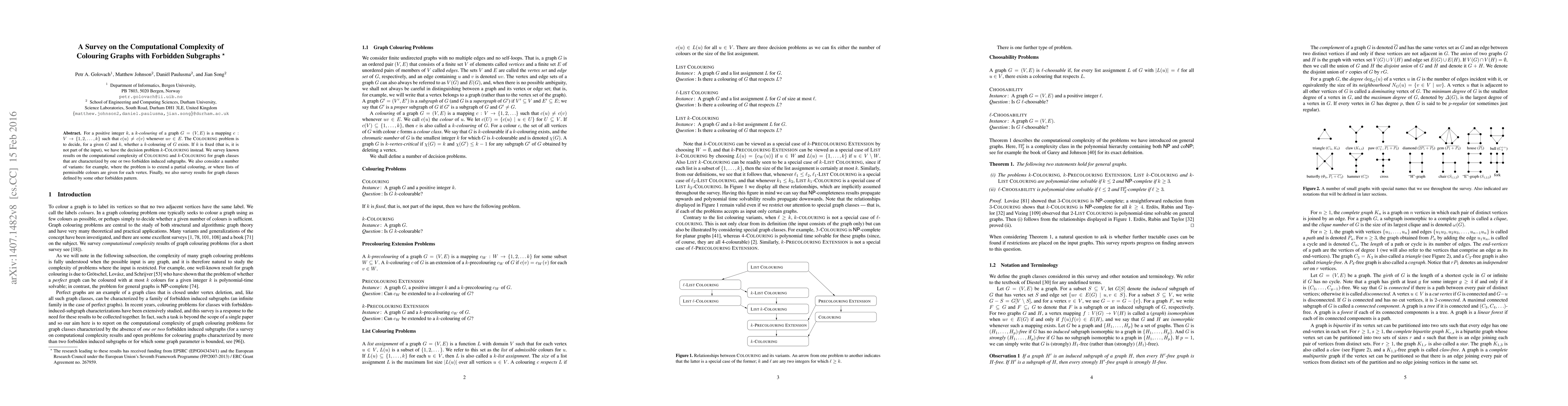 For a positive integer $k$, a $k$-colouring of a graph $G=(V,E)$ is a mapping $c: V\rightarrow\{1,2,...,k\}$ such that $c(u)\neq c(v)$ whenever $uv\in E$. The Colouring problem is to decide, for a given $G$ and $k$, whether a $k$-colouring of $G$ exists. If $k$ is fixed (that is, it is not part of the input), we have the decision problem $k$-Colouring instead. We survey known results on the computational complexity of Colouring and $k$-Colouring for graph classes that are characterized by one or two forbidden induced subgraphs. We also consider a number of variants: for example, where the problem is to extend a partial colouring, or where lists of permissible colours are given for each vertex.