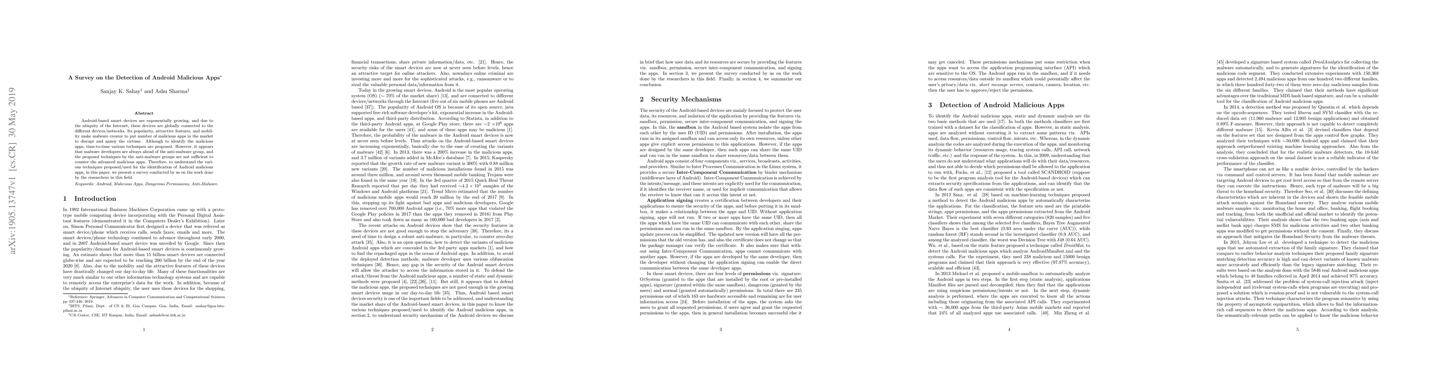 Android-based smart devices are exponentially growing, and due to the ubiquity of the Internet, these devices are globally connected to the different devices/networks. Its popularity, attractive features, and mobility make malware creator to put a number of malicious apps in the market to disrupt and annoy the victims. Although to identify the malicious apps, time-to-time various techniques are proposed. However, it appears that malware developers are always ahead of the anti-malware group, and the proposed techniques by the anti-malware groups are not sufficient to counter the advanced malicious apps. Therefore, to understand the various techniques proposed/used for the identification of Android malicious apps, in this paper, we present a survey conducted by us on the work done by the researchers in this field.