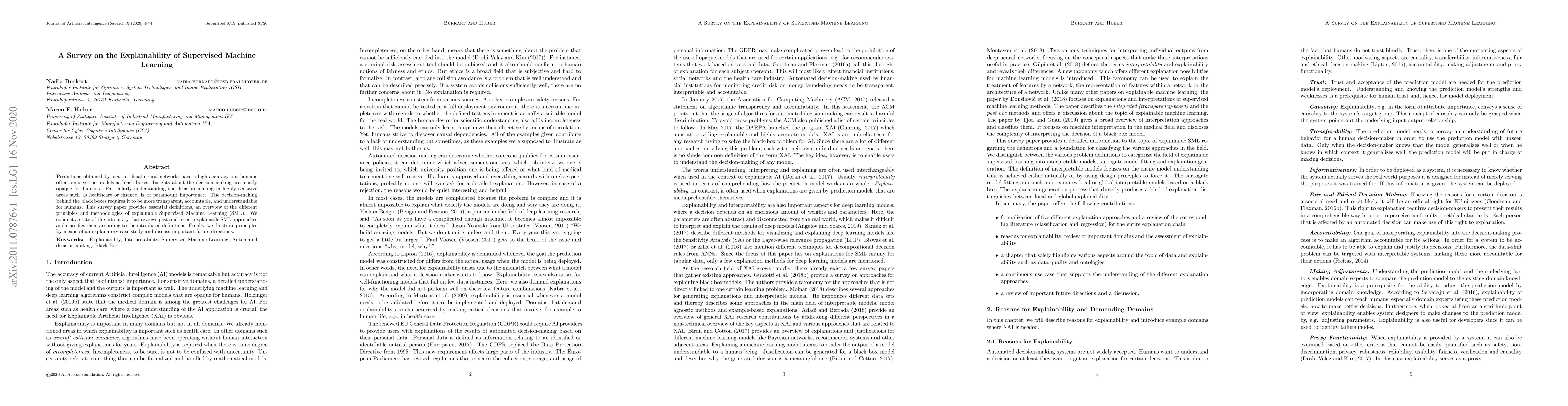 Predictions obtained by, e.g., artificial neural networks have a high accuracy but humans often perceive the models as black boxes. Insights about the decision making are mostly opaque for humans. Particularly understanding the decision making in highly sensitive areas such as healthcare or fifinance, is of paramount importance. The decision-making behind the black boxes requires it to be more transparent, accountable, and understandable for humans. This survey paper provides essential definitions, an overview of the different principles and methodologies of explainable Supervised Machine Learning (SML). We conduct a state-of-the-art survey that reviews past and recent explainable SML approaches and classifies them according to the introduced definitions. Finally, we illustrate principles by means of an explanatory case study and discuss important future directions.