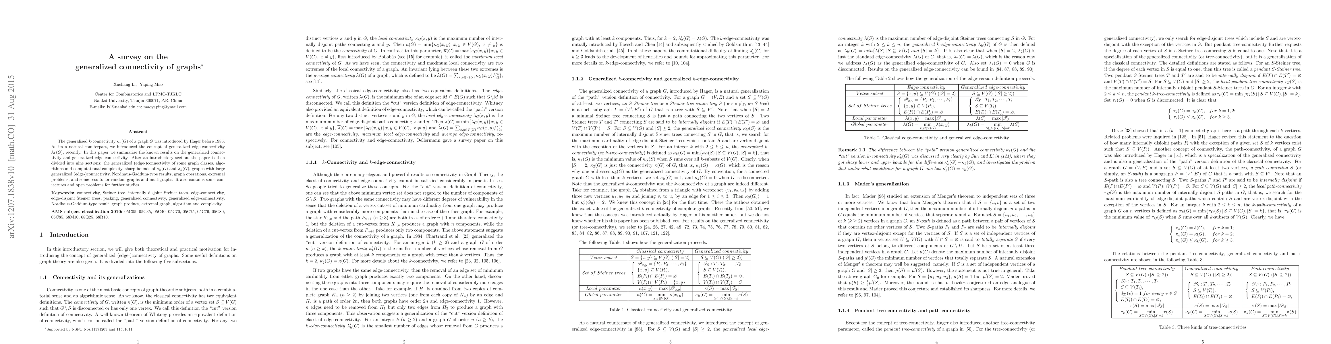 The paper provides a comprehensive survey on the generalized connectivity of graphs, summarizing known results on generalized connectivity ($\kappa_k(G)$) and generalized edge-connectivity ($\lambda_k(G)$). It covers graph classes, algorithms, computational complexity, bounds, extremal problems, and results for random graphs and multigraphs, along with conjectures and open problems.