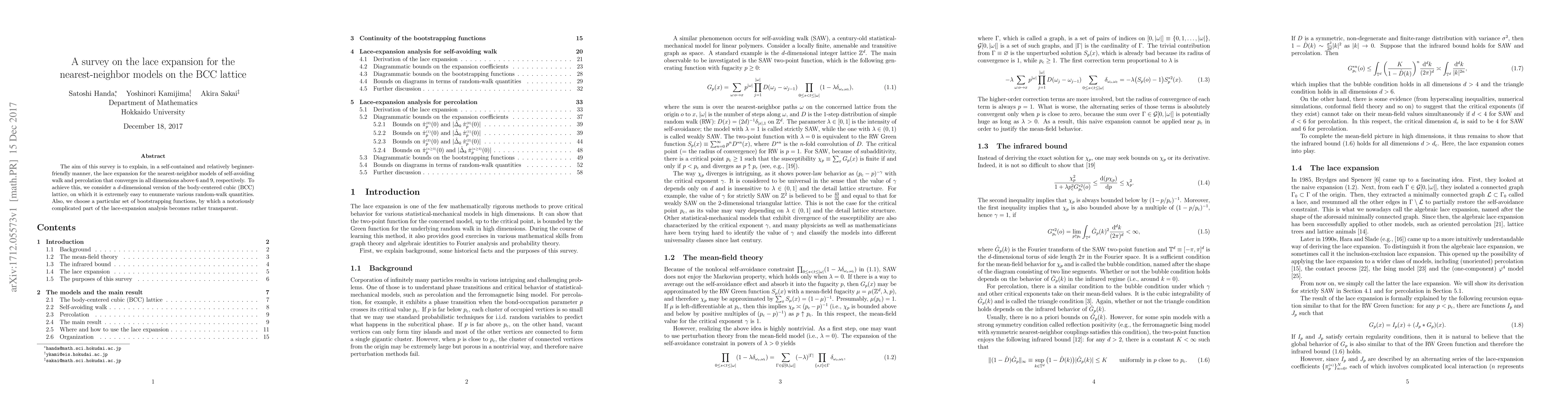 The aim of this survey is to explain, in a self-contained and relatively beginner-friendly manner, the lace expansion for the nearest-neighbor models of self-avoiding walk and percolation that converges in all dimensions above 6 and 9, respectively. To achieve this, we consider a $d$-dimensional version of the body-centered cubic (BCC) lattice, on which it is extremely easy to enumerate various random-walk quantities. Also, we choose a particular set of bootstrapping functions, by which a notoriously complicated part of the lace-expansion analysis becomes rather transparent.
