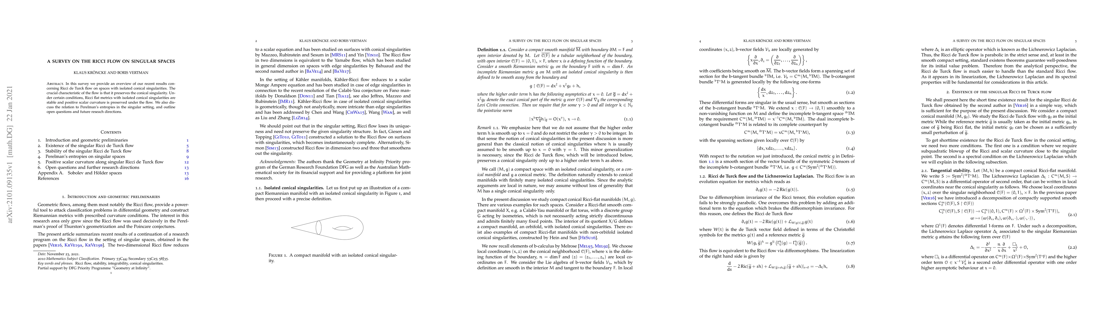 This survey explores the Ricci de Turck flow on spaces with isolated conical singularities, highlighting its ability to preserve these singularities. It discusses the stability of Ricci flat metrics and the preservation of positive scalar curvature under the flow, and relates these findings to Perelman's entropies in the singular context.