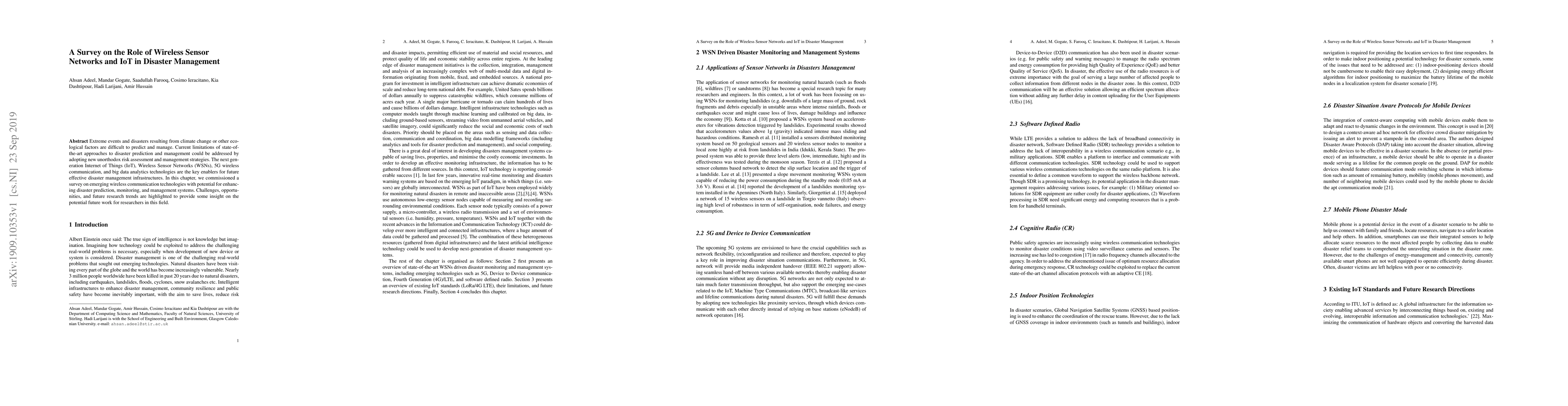 This paper surveys the potential of Wireless Sensor Networks and IoT technologies to enhance disaster prediction, monitoring, and management. It highlights the challenges and opportunities presented by next-generation communication technologies and big data analytics for improving disaster management infrastructures.